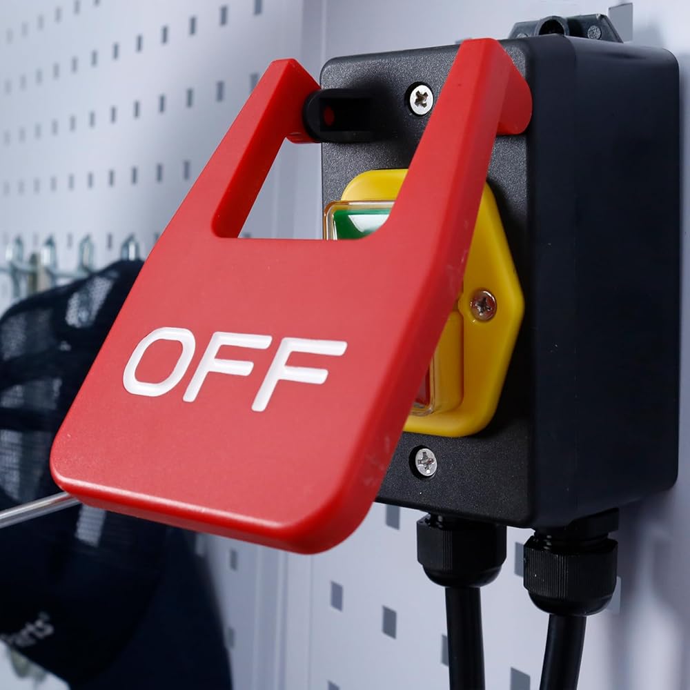 【HIGHLY VISIBLE EMERGENCY PADDLE – INSTANT POWER CUT】 The large red “OFF” paddle is highly conspicuous for easy pressing in emergencies. A plastic cover protects the switch mechanism, making it suitable for workplace use. The recessed green “ON” button prevents accidental activation—ideal for quick, intuitive, and safe operation.