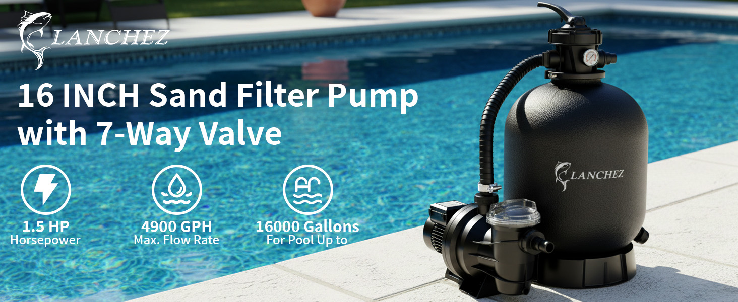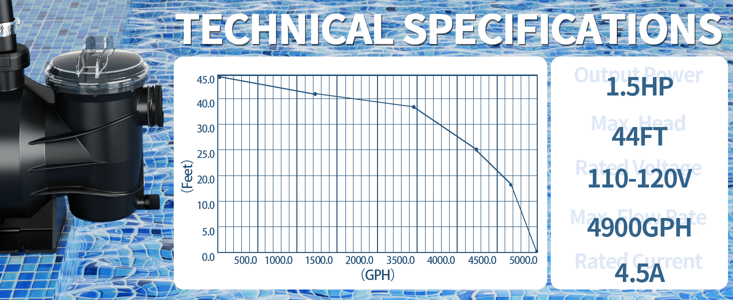 الحد الأقصى للتدفق 4900 جالون في الساعة: يمكن لمضخة حمام السباحة بقوة 1.5 حصان ضخ ما يصل إلى 4900 جالون في الساعة، مما يجعلها مثالية لحمامات السباحة ذات سعة قصوى تصل إلى 16000 جالون وتضمن ترشيح سريع وشامل للمياه.