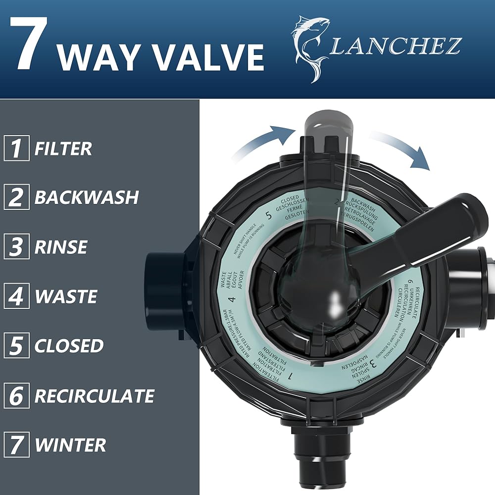 صمام 7 اتجاهات: يتميز بصمام 7 اتجاهات مع قناة متماثلة مستقرة وموثوقة وتصميم مضاد للاضطرابات. يتكيف هذا بسهولة مع احتياجات الترشيح المختلفة، مما يضمن بقاء بيئة حمام السباحة الخاصة بك زرقاء صافية طوال الصيف
