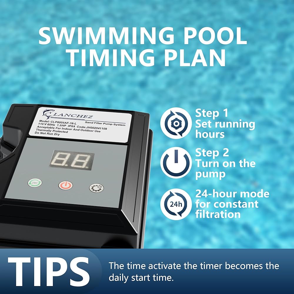 ترشيح مخصص: يقوم المؤقت القابل للبرمجة على مدار 24 ساعة بجدولة دورات الترشيح مسبقًا، مما يحافظ على نظافة حمام السباحة الخاص بك دون عناء، وتوفير الطاقة، والحفاظ على الدورة الدموية المثالية للمياه.