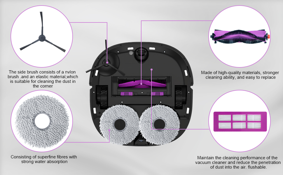 【وظيفة المنتج】: يمكن للفرشاة الدوارة إزالة مساحات كبيرة من القمامة، ويمكن للفرشاة الجانبية الوصول إلى الزوايا والحواف لإزالة المزيد من الأوساخ والأوساخ والغبار، ويمكن أن تساعدك الممسحة أثناء استخدام المكنسة الكهربائية الروبوتية، حتى يصبح الهواء من حولك نظيفًا كأنه جديد.