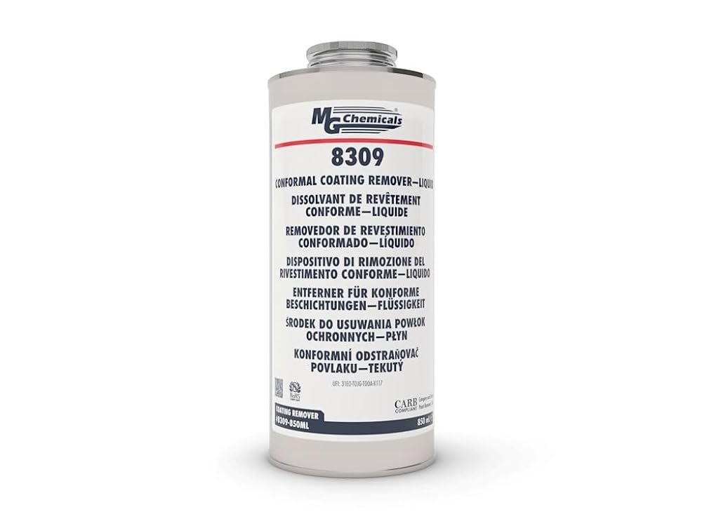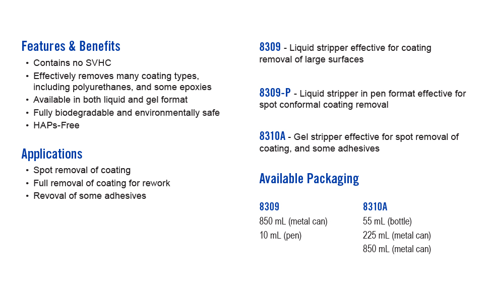 The 8309 Conformal Coating Stripper is available in both liquid and pen format. It removes most rework able conformal coatings and readily removes thermoplastic (non-cross linked) acrylics, urethanes, and silicones based conformal coatings. It also facilitates the removal of some thermoset coatings like cross-linked silicones and polyurethanes by softening or swelling the coat to aid with mechanical removal.This stripper is safe for most types of PCB components. It is fully biodegradable and environmentally safe.Applications & UsagesThe primary applications of the 8309 are for PCB maintenance and repairs. It also works well for removing conductive ink lacquers. The low viscosity allows PCBs to be easily submersed in the stripper solution.