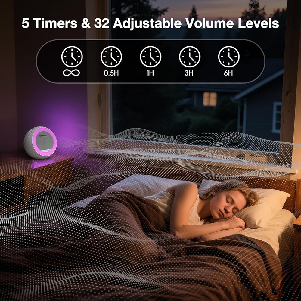 ⏰[5 مؤقتات للنوم ووظيفة الذاكرة] - تم تصميمها كآلة صوت مثالية للنوم، فهي توفر 5 إعدادات مؤقت للإيقاف التلقائي (30 دقيقة، أو ساعة واحدة، أو 3 ساعات، أو 6 ساعات، أو مستمر). تتذكر الذاكرة الذكية إعداداتك الأخيرة لروتين خالي من المتاعب كل ليلة.