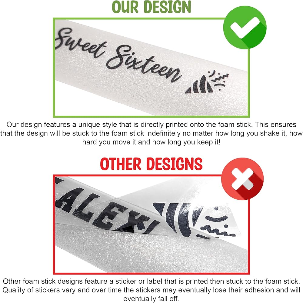 Printed design: These Mr Party King Foam Sticks feature a printed design. Many designs have a sticker rather than the design being printed directly on the foam stick which can eventually lose its adhesion and fall off. These, however, have the design printed directly on the foam stick so you can wave them as much as you want wthout worry!