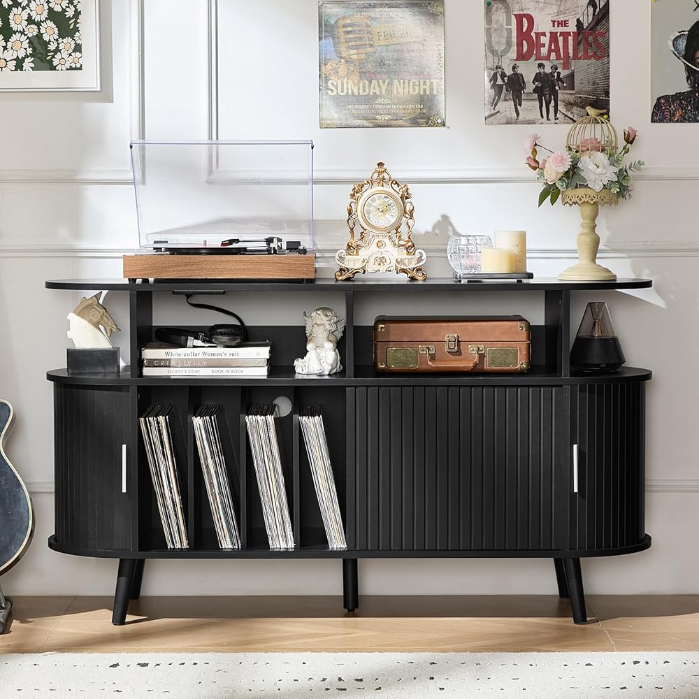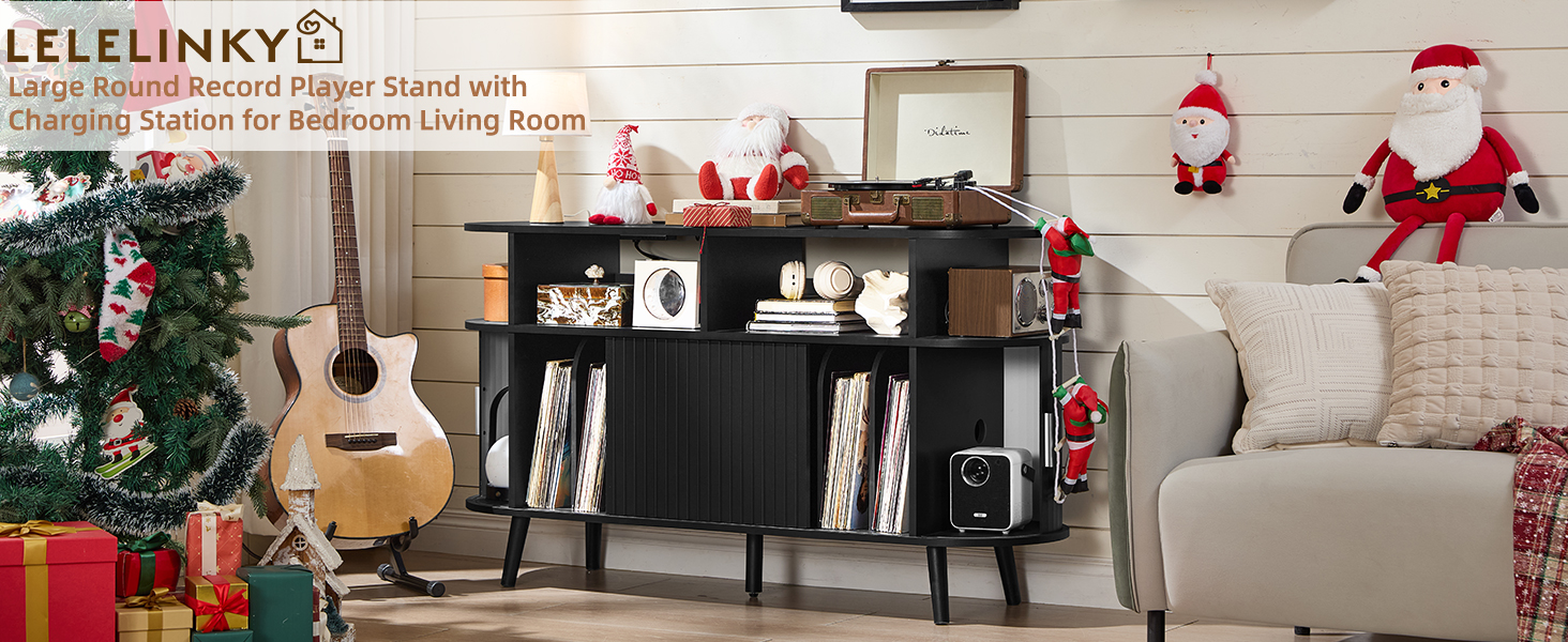 حامل مشغل تسجيل مستدير كبير من LELELINKY مع محطة شحن ولوحة مخددة، وخزانة قابلة للدوران لمنزل المزرعة السوداء مع مساحة تخزين فينيل عتيقة، وطاولة مشغل تسجيل خشبية مقوسة لغرفة المعيشة