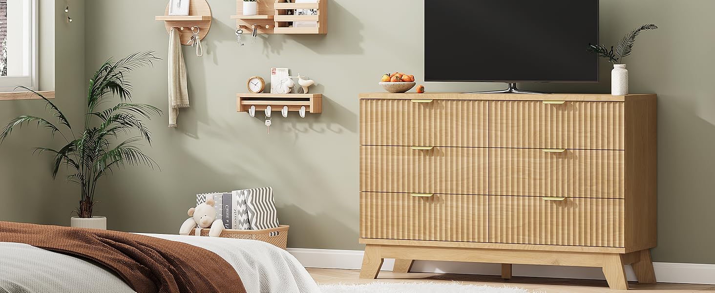 【سعة تخزين كبيرة】تتميز خزانة الملابس بـ 6 أدراج عميقة توفر مساحة كبيرة لتنظيم الملابس أو الفراش أو مستحضرات التجميل أو المجوهرات، مما يساعدك على الحفاظ على مساحة أنيقة ومرتبة. يمكن استخدام سطح الطاولة الخشبي العريض كحامل تلفزيون في خزانة الملابس أو عرض ديكوراتك مثل إطارات الصور أو النباتات أو المرايا. مثالية لغرفة النوم، وغرفة المعيشة، والممر، والمدخل
