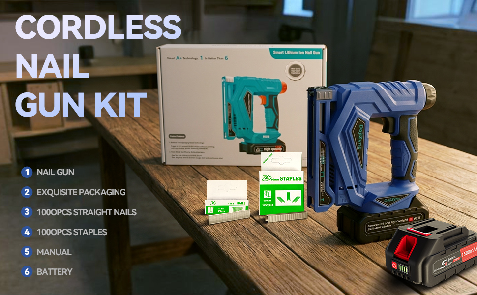 مجموعة الكل في واحد جاهزة للاستخدام: افتح الصندوق وابدأ على الفور - تشتمل المجموعة على مسدس أظافر وبطارية وشاحن ومثبتات وجميع الملحقات؛ لا حاجة إلى مشتريات إضافية