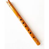 professional wood quena from peru, quena has 6 hole in front and one behind, also a U shape on top to blow and get the sound, this is a solid wood quena of huayruro peruvian wood, red wine color varnished, you can get 3 octaves on this quena that is tuned in G major 440, has 16 in tall x 1.3 diameter the weight is 5.8 oz, comes in a white box and we ship in a tube to better protection.