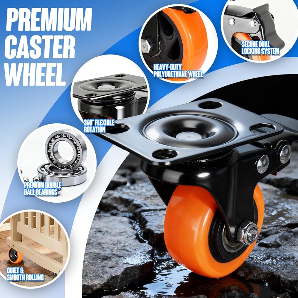 مجموعة عجلات 2 بوصة مكونة من 4 عجلات، عجلات صغيرة من البولي يوريثان بقفل مزدوج 150 رطل لكل منها، عجلات دوارة 360 درجة للأثاث والعربة ومنضدة العمل - هادئة وناعمة وآمنة على الأرض