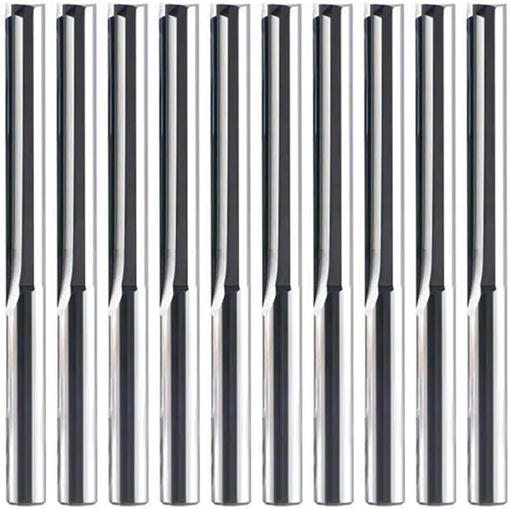 10pcs Two Flutes Straight Slot Milling Tools Cutting Edge Length(CEL): 4-62mmOverall Length(OVL): about 38-100mmApplicable materials:Cutting/Engraving/Carving/Grooving/Slotting/Drilling/Hollowing/Positioning/Roughing /Milling in materials likeMDF PVC Acrylic wood solid wood chipboard composite board organic board core board density board etc.Package Included:10PCS Straight Slot Milling Cutter