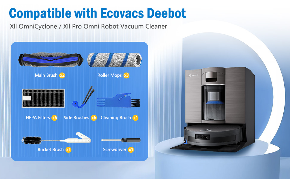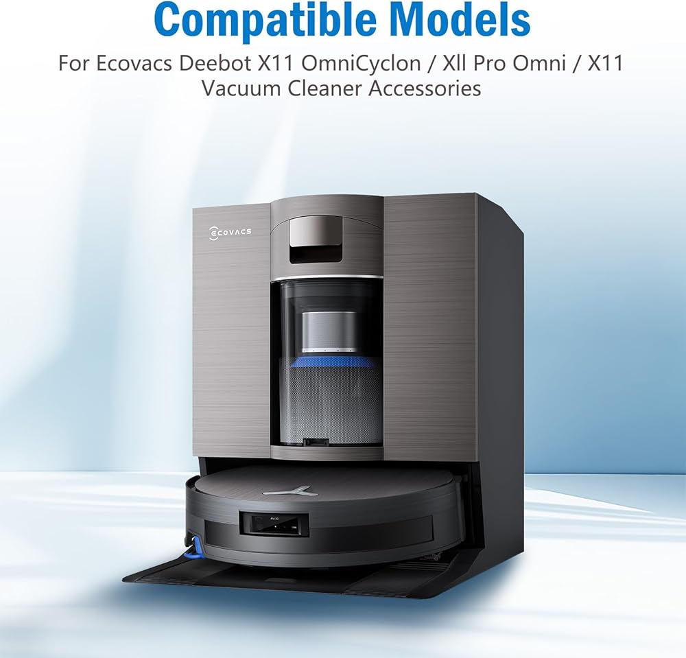• الطرز المتوافقة: مجموعة ملحقات بديلة للمكانس الكهربائية الروبوتية Ecovacs Deebot X11 OmniCyclone/X11 Pro Omni/X9 Pro Omni/T80S Omni. ⚠️ يرجى التأكد من طراز المكنسة الكهربائية الروبوتية الخاصة بك قبل الشراء. تحتوي المجموعة على 20 قطعة: 2 فرشاة رئيسية، 3 ممسحات دوارة، 6 فرش جانبية، 6 مرشحات هيبا، و3 أدوات