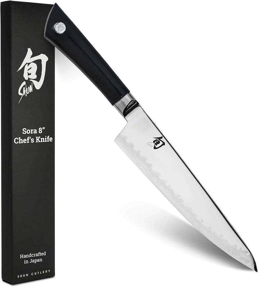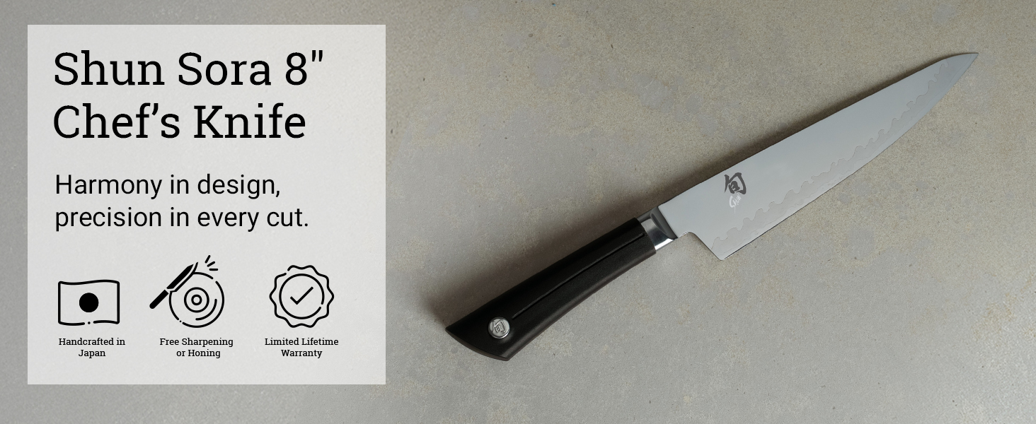 JAPANESE CHEF KNIFE: The Shun Sora 8-inch Chef's Knife is expertly designed for a variety of kitchen tasks, from slicing and dicing to mincing, making it an indispensable tool for any cook.