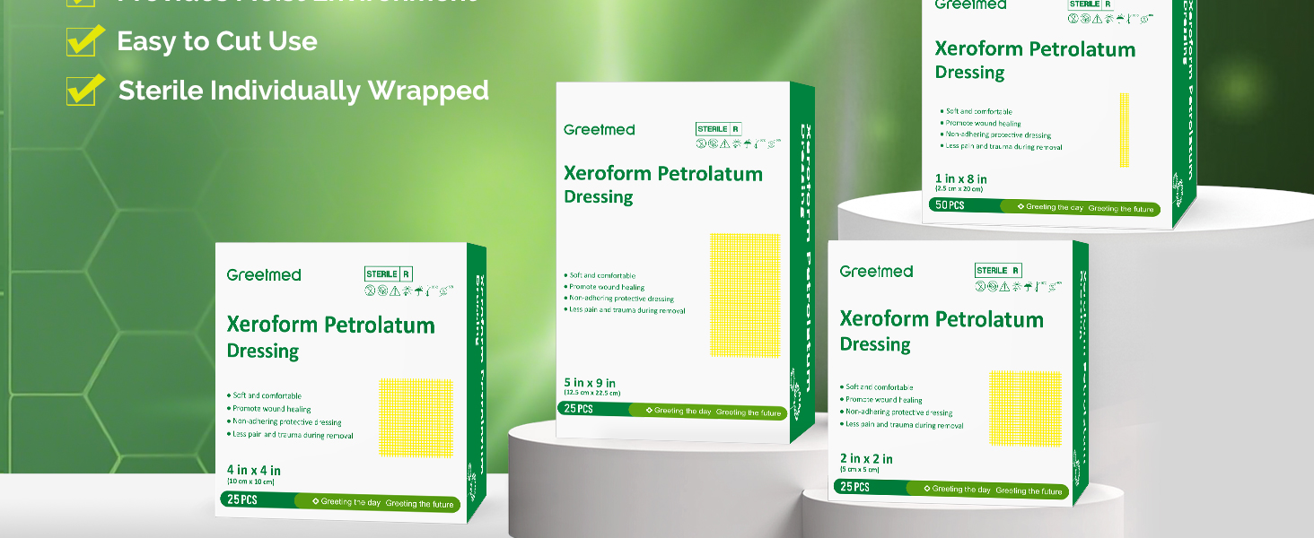 Greetmed Xeroform Petrolatum Dressing 2inx2in 25 حزمة فردية من ضمادات الجروح، وسادات شاش غير ملتصقة للجروح، وحروق السماكة الجزئية، والتمزقات، وترقيع الجلد، والمواقع المتلقية، والجروح المخيطة in Kuwait