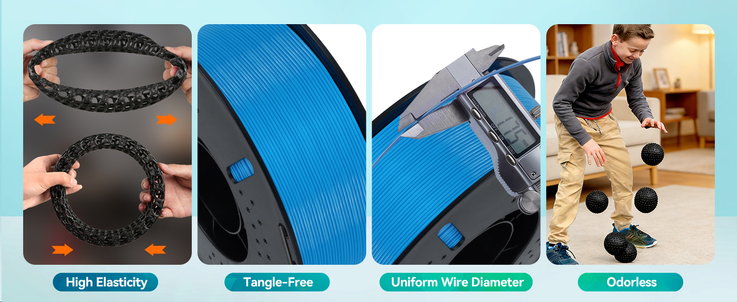 • أبعاد عالية الدقة لا مزيد من الانسدادات: لا داعي للقلق بعد الآن بشأن انسداد خيوط TPU الخاصة بك أو مشاكل تزييف الطباعة! يضمن الالتصاق الممتاز للطبقات البينية والتسامح المستمر للقطر (±0.03 مم) قذفًا مستمرًا وسلسًا، مما يقلل بشكل فعال من خطر تكسر الشعيرات. تعمل الصيغة المحسنة بشكل أفضل ضمن نطاق درجة حرارة الطباعة الذي يتراوح بين 190 و210 درجة مئوية وسرعة طباعة تبلغ 50 مم/ثانية.