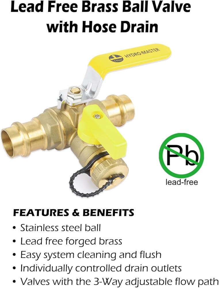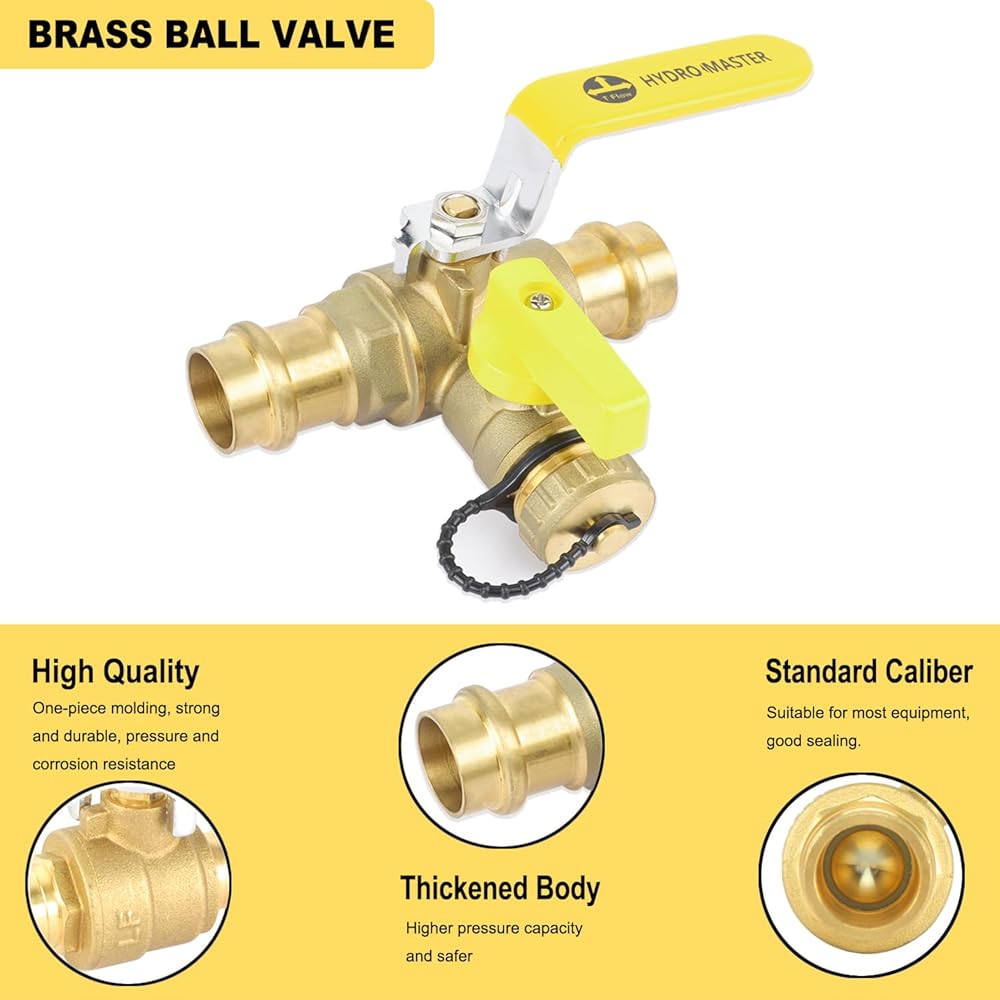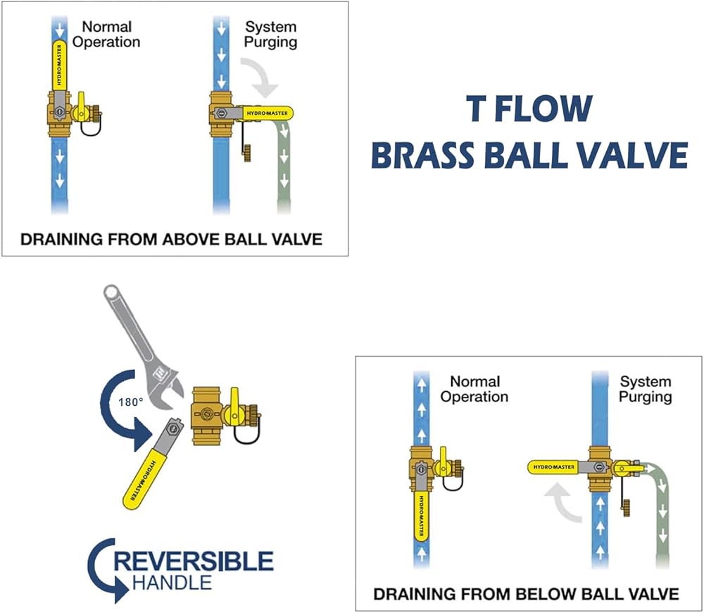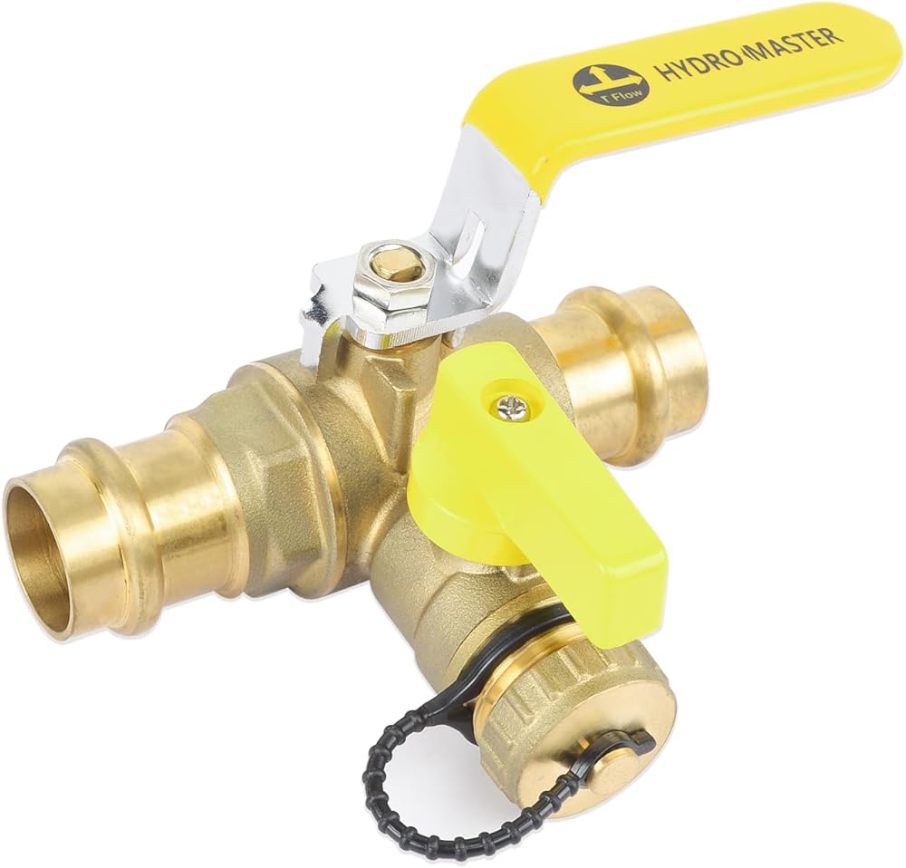 This versatile 3/4-inch brass ball valve from HYDRO MASTER features a T-flow design with three ports and an integrated drain function, making it ideal for various plumbing and industrial applications. Constructed from durable brass with a polished brass exterior finish, this valve offers reliable performance. Designed for long-lasting performance in commercial and residential plumbing systems. The three-way configuration allows for multiple flow path options, enhancing its utility in complex plumbing setups.