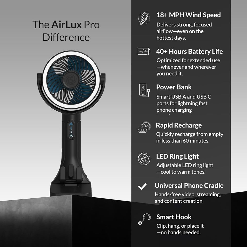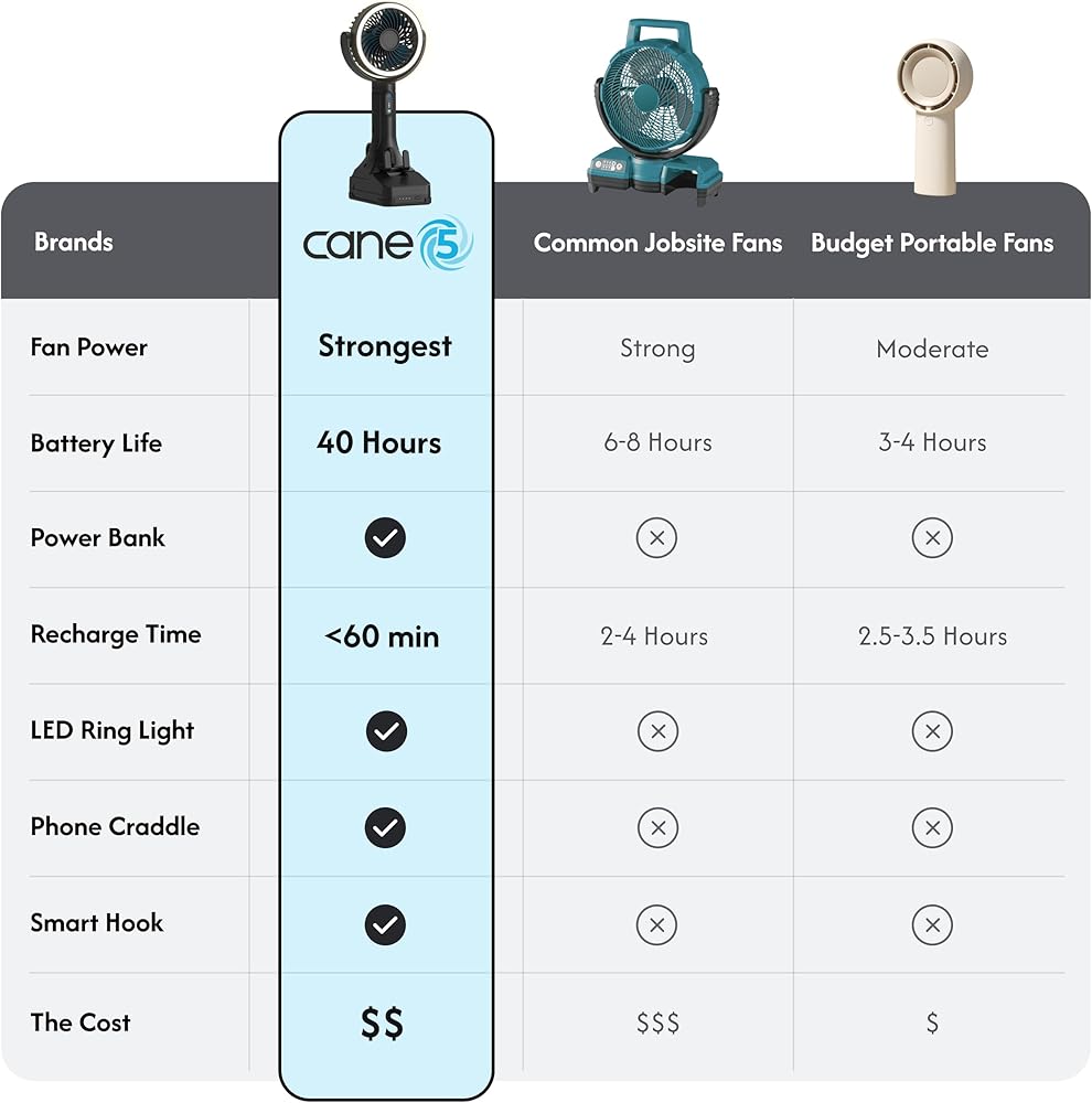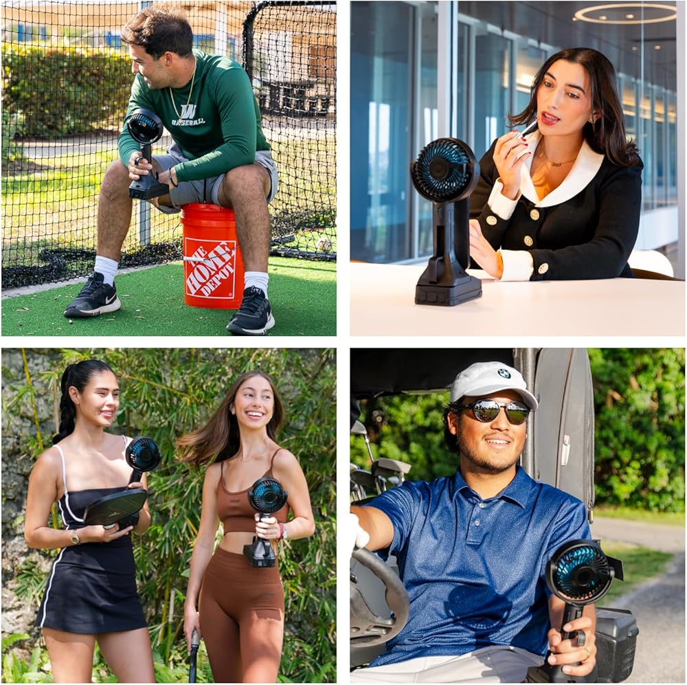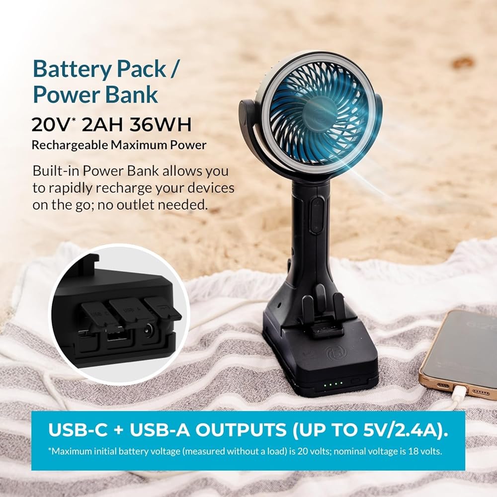 أقوى مروحة محمولة الكل في واحد: تولد سرعات رياح تزيد عن 18 ميلاً في الساعة مع خمسة إعدادات سرعة قابلة للتعديل؛ يوفر تدفق هواء عالي السرعة للتبريد عند البوابات الخلفية أو ألعاب الكرة أو المعسكرات أو العمل في الهواء الطلق