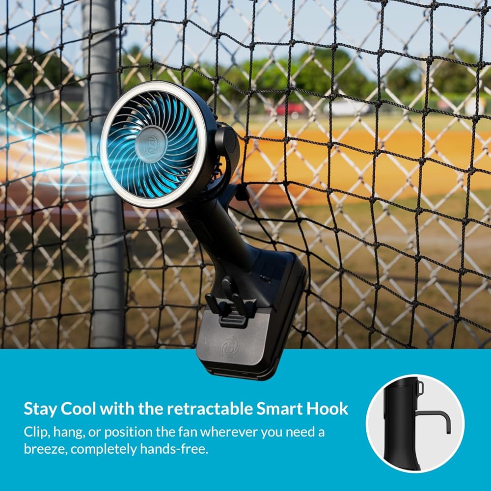 إمالة قابلة للتعديل: رأس محوري 180 درجة يوجه تدفق الهواء بالضبط حيثما تحتاجه؛ خطاف قابل للطي يسمح بالتركيب على الأسوار أو الكراسي أو عربات الأطفال للحصول على راحة دقيقة دون استخدام اليدين