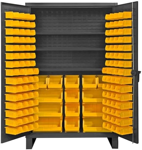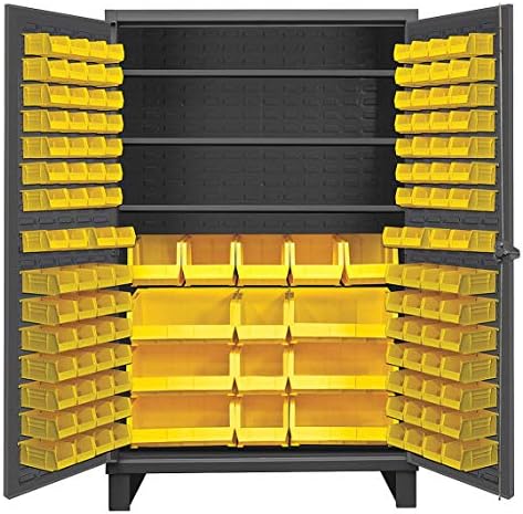 Durham extra heavy duty all welded 12 gauge steel cabinet with 134 bins and 4 adjustable shelves. 3-point cast steel locking handle with 3/8-inches diameter rods and provision for a padlock (padlock not provided). Shelves bolt into place easily using fasteners provided and adjust on 2-1/2-inches centers. 7 gauge leaf hinges to prevent sagging. 6-inches height base/legs which provide access for forklifts; pre-drilled holes allow for lagging to the floor (constructed of 3/16-inches steel). Durable gray powder coat finish. Fully welded louvered panels reinforce door and hold hook-on bins. Allows weight capacity of 650 lbs per door. Bins hook into place, no tools required. Bins measures (60) 4-inches width by 3-inches height by 5-inches depth; (60) 4-inches width by 3-inches height by 7-inches depth; (8) 8-inches width by 7-inches height by 15-inches depth; (6) 16-inches width by 7-inches height by 15-inches depth.