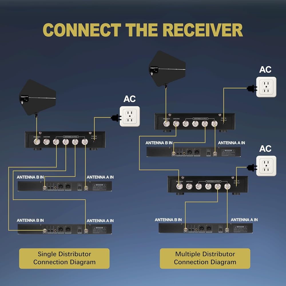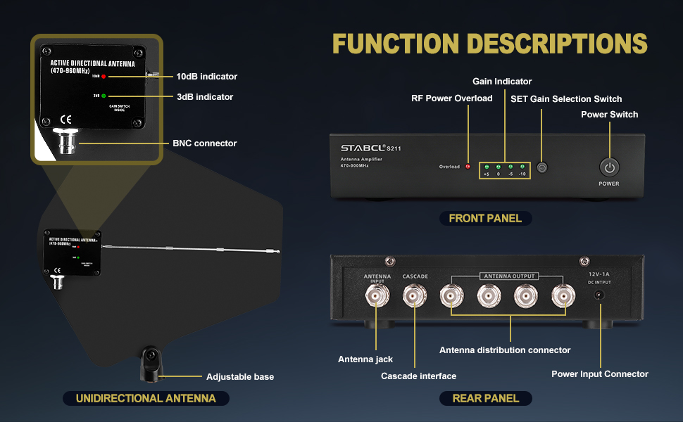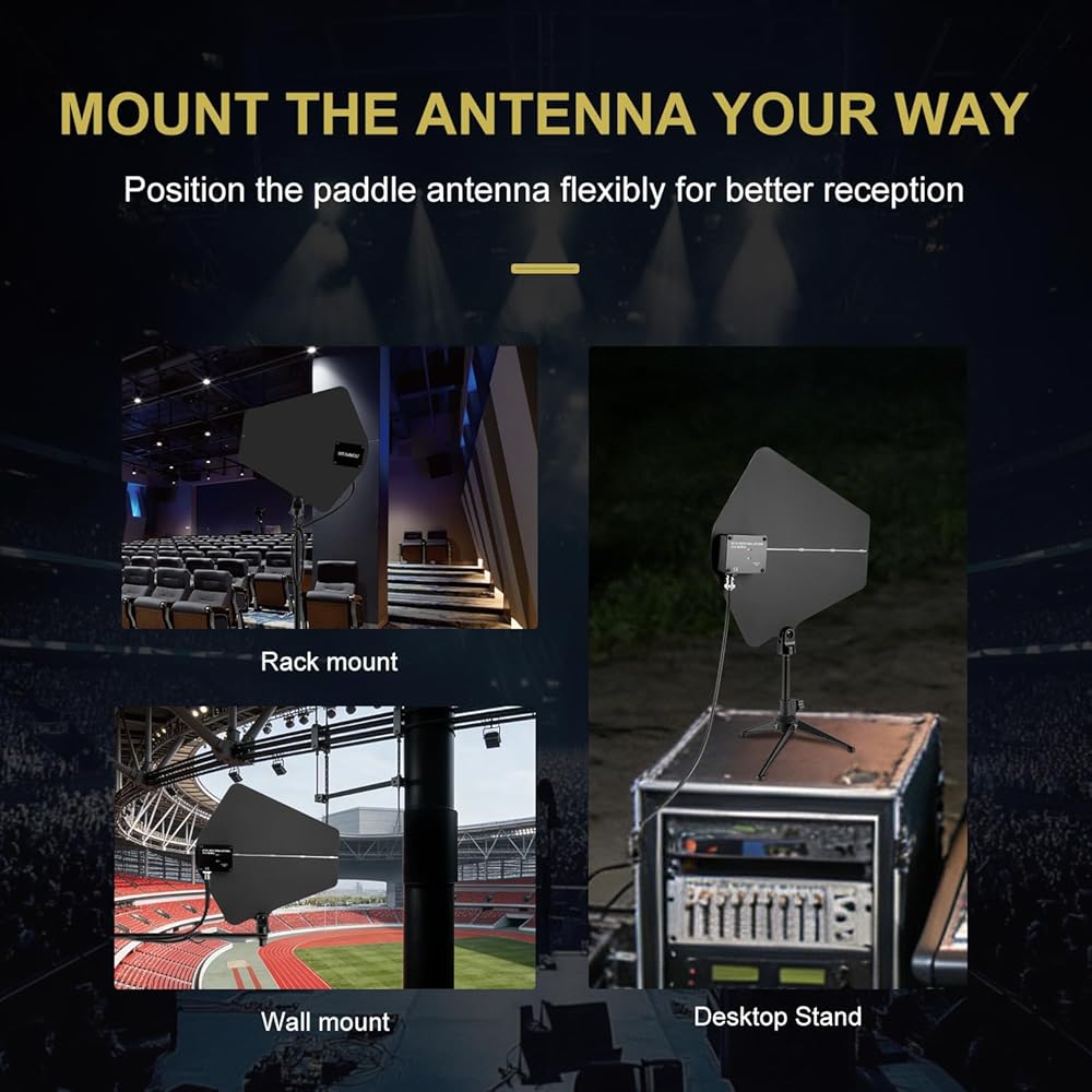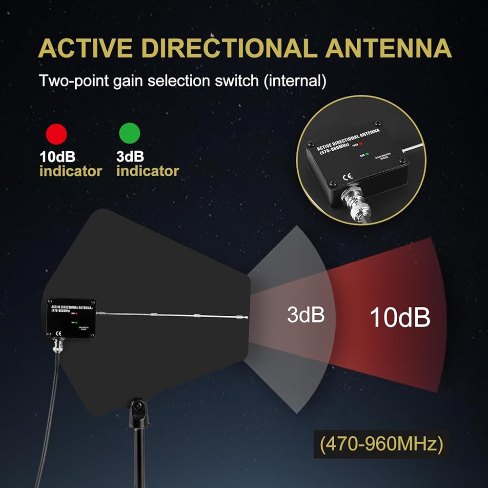 التوافق الواسع: يغطي نظام توزيع الهوائي الاحترافي نطاق التردد الكامل UHF 400-950 ميجا هرتز وهو متوافق مع جميع الميكروفونات اللاسلكية UHF تقريبًا. يتم استخدام مضخم الهوائي S211 لتعزيز مسافة الاستقبال بشكل فعال وتجنب التداخل وفقدان الإشارة الناجم عن ازدحام الإشارة بين أجهزة الاستقبال اللاسلكية المتعددة. يبلغ طول خط استقبال الإشارة للهوائي الاتجاهي 3M/10FT، وهو مناسب للتحرك إلى اتجاه استقبال الإشارة حسب الرغبة