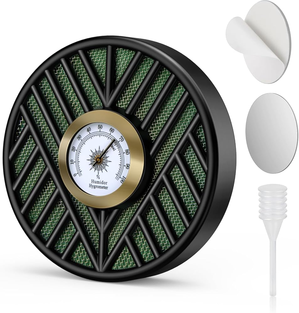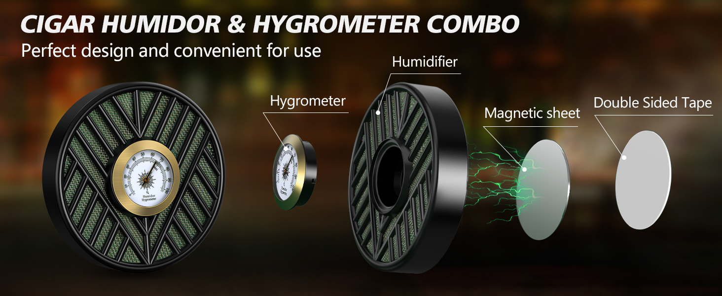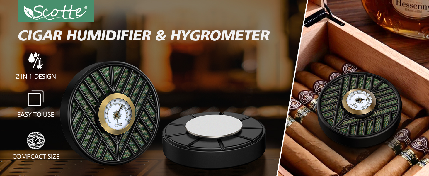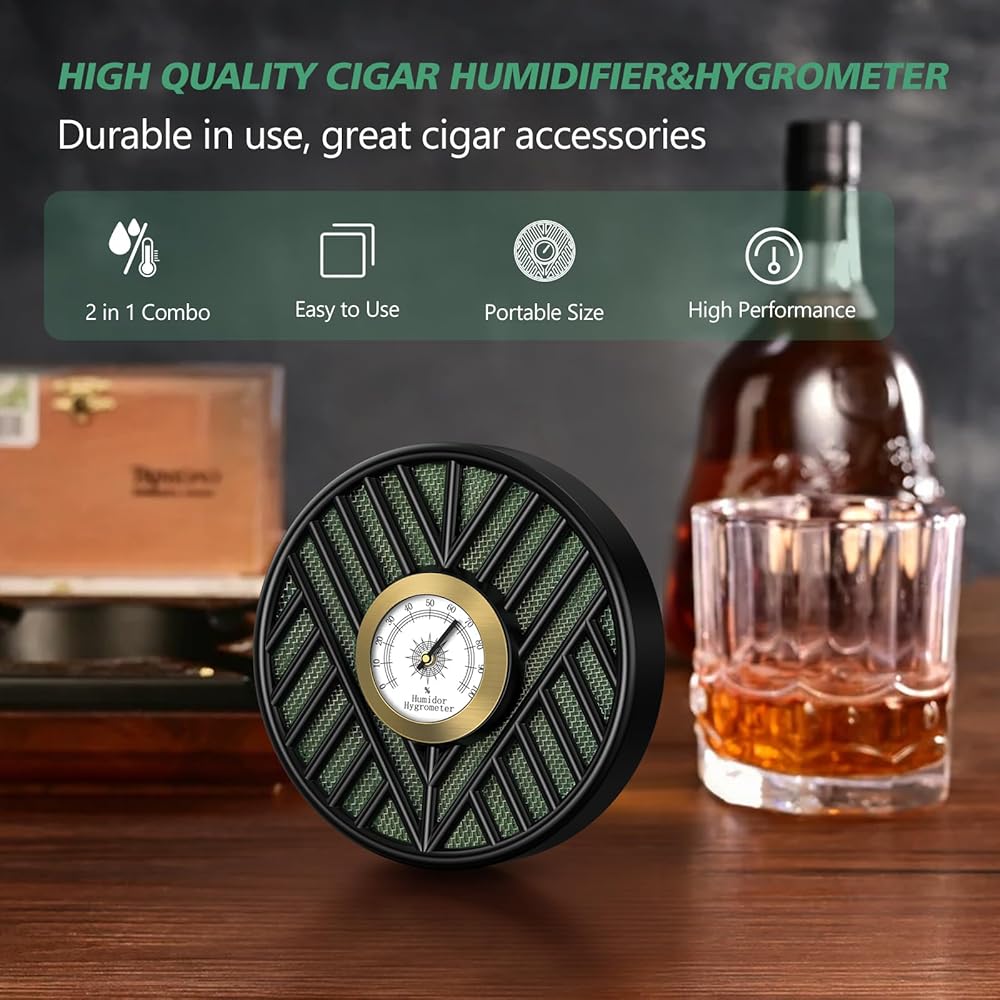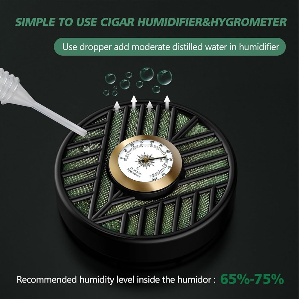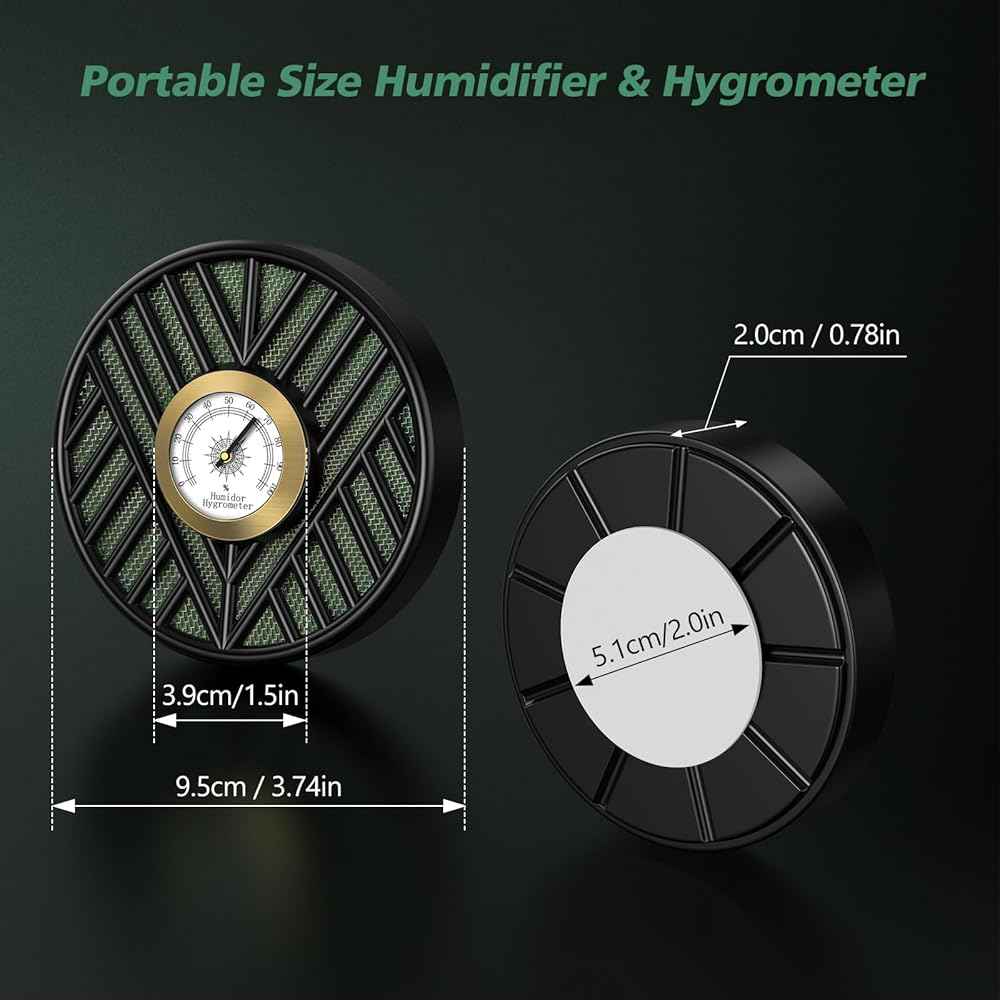 مقياس رطوبة السيجار: مقياس الرطوبة هذا مصنوع من معدن وزجاج عالي الجودة من أجل المتانة؛ يوفر مقياس الرطوبة الخاص بنا تتبعًا دقيقًا للرطوبة وقراءات في الوقت الفعلي لمساعدتك على ضمان ظروف رطوبة مثالية للتخزين الأمثل للسيجار الخاص بك، كما أن مقياس الرطوبة الخاص بنا تمت معايرته مسبقًا، لذلك لا تحتاج إلى ضبطه مسبقًا، وهو أمر مريح للغاية.