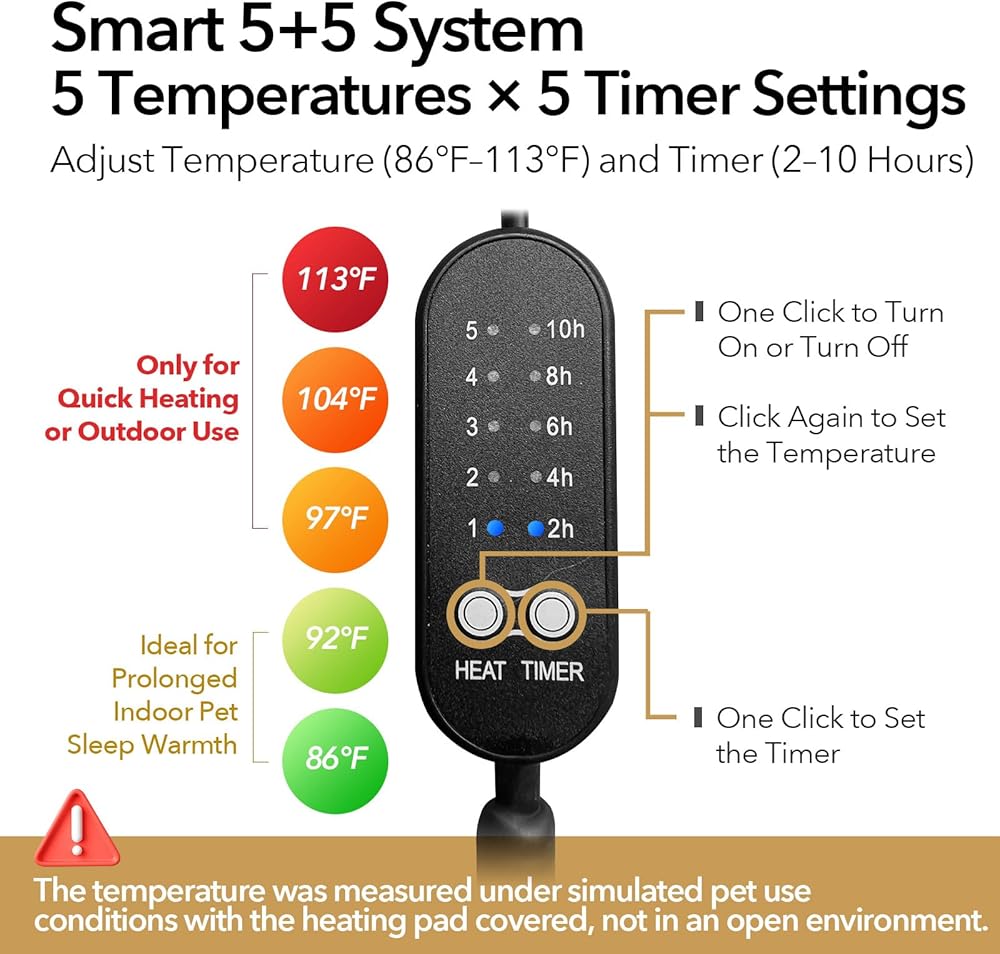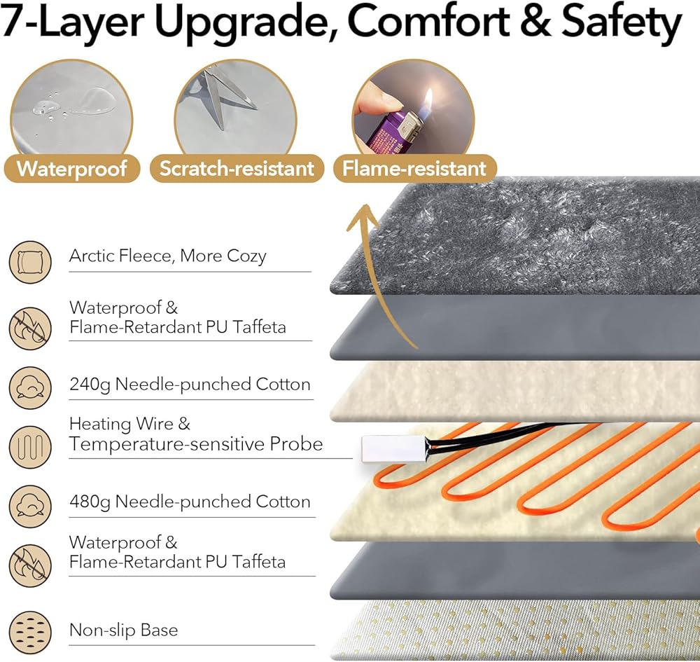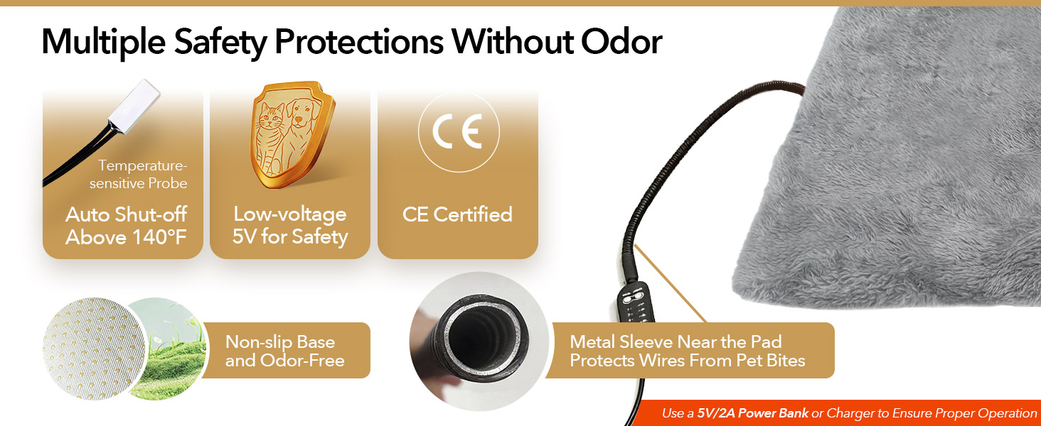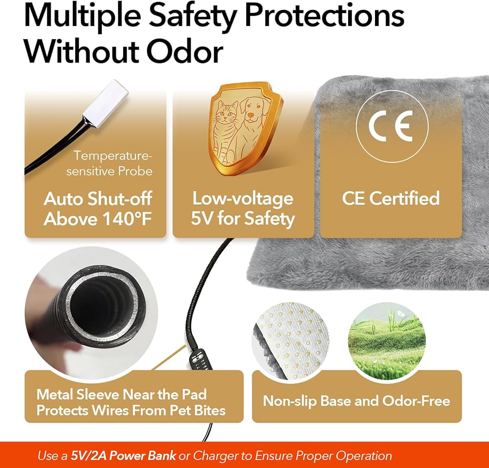 أمان متقدم: إيقاف تلقائي عند درجة حرارة 140 درجة فهرنهايت وسلك مقاوم للمضغ: مصمم للاستخدام بدون قلق: حماية تلقائية من الحرارة الزائدة عند 60 درجة مئوية/140 درجة فهرنهايت وطاقة USB منخفضة الجهد 5 فولت تقضي على مخاطر ارتفاع درجة الحرارة. تتميز الوسادة الداخلية بسطح مقاوم للماء ومثبط للاشتعال، بينما يمنع السلك المعدني المقاوم للمضغ بالقرب من الوسادة الحيوانات الأليفة من العض عبر السلك - وهي طبقة إضافية من الأمان للمضغين الفضوليين.