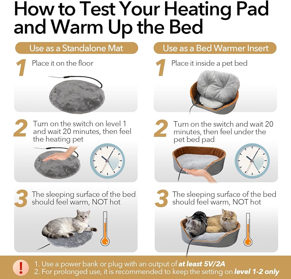 نصائح الاستخدام: 1. استخدم بنك الطاقة/الشاحن مع مخرج أكثر من 5V2A. 2. نصيحة بشأن درجة الحرارة: للحصول على قيلولة طويلة للحيوانات الأليفة، حدد المستوى 1-2. استخدم المستوى 3-4 (97 درجة فهرنهايت - 113 درجة فهرنهايت) للإحماء السريع في الظروف الباردة. 3. التنظيف: غطاء الصوف القطبي الشمالي وحقيبة التخزين المخملية يمكن غسلهما في الغسالة. وسادة التدفئة يمكن تنظيفها بالمسح فقط
