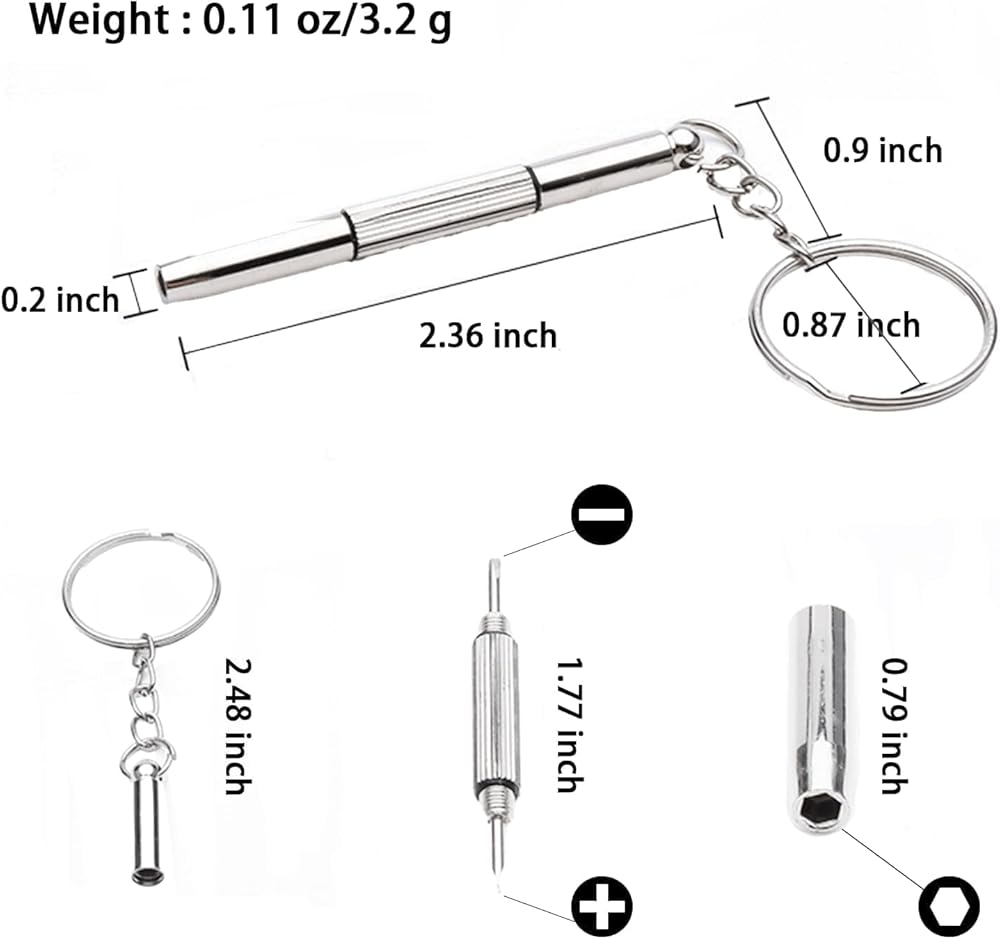 مجموعة الأدوات: تتضمن مفك براغي 3 في 1 - برأس حرف واحد، ورأس متقاطع، ومسدس داخلي، والذي يمكن استخدامه أيضًا في مشاهد أخرى مثل الساعات والكاميرات. بالإضافة إلى ذلك، يوجد زوج من الملاقط الملائمة لربط البراغي، كما يعمل مشبك الأذن المضاد للانزلاق للنظارة على تحسين راحة الارتداء
