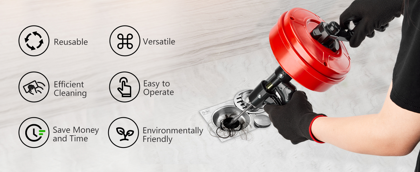 • تذكير لطيف: يجب على غير المحترفين مراجعة التعليمات قبل استخدام ثعبان السباكين هذا في عمليات التصريف أو التصريف الكهربائي. قم دائمًا بارتداء القفازات مع مجموعة الثعابين السباكة هذه للحفاظ على النظافة أثناء عمليات تنظيف ثعبان المجاري أو ثعبان حوض الاستحمام.