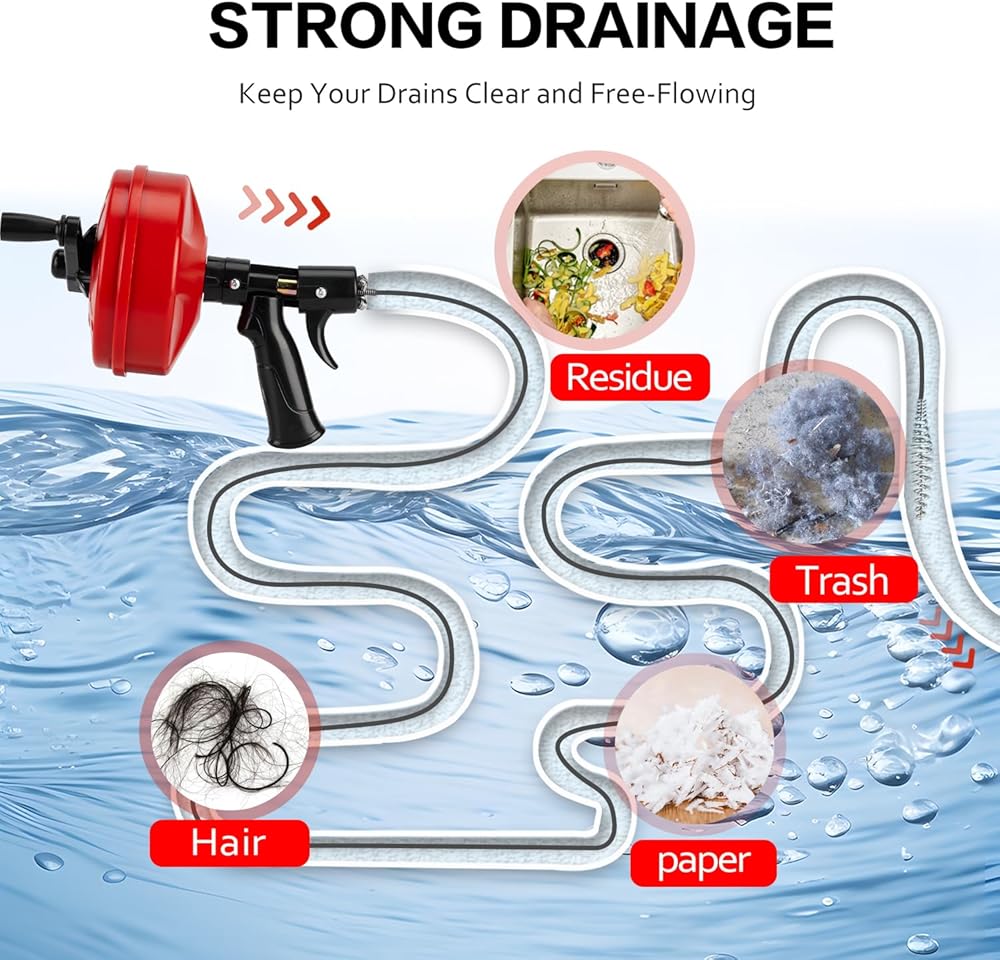 • تصميم مطور: يتميز برأس قاطع حلزوني وقمع لتعزيز حركة ثعبان الأنابيب في أحواض الاستحمام والأحواض ومصارف الدش. يضمن غلاف الأسطوانة القوي ABS وقبضة المسدس التحكم المريح كثعبان سباكة لمزيل انسداد المرحاض أو المطبخ