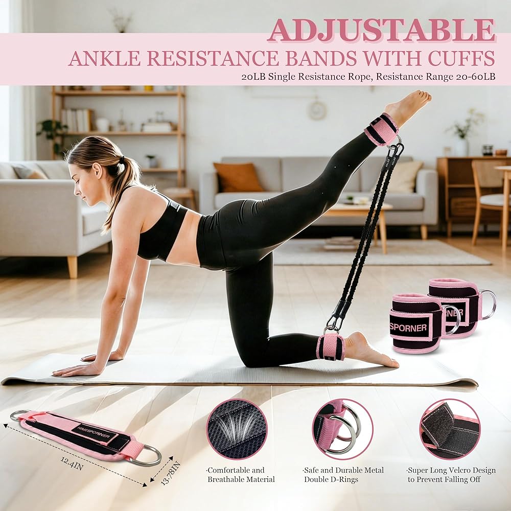 【حزام مقاوم للكاحل مريح ومتين】أحزمة الكاحل مصنوعة من مواد مريحة ومسامية، مع حلقات مزدوجة على شكل حرف D لضمان السلامة والمتانة. تصميم الفيلكرو الممتد يلتف بشكل آمن حول الكاحل لمنعه من السقوط. تشتمل المجموعة على ثلاثة أنابيب مقاومة من اللاتكس بأكمام لمزيد من الأمان، ومنع إصابات الكسر، كل منها بمقاومة 20 رطل، قابلة للتعديل من 20 إلى 60 رطل.