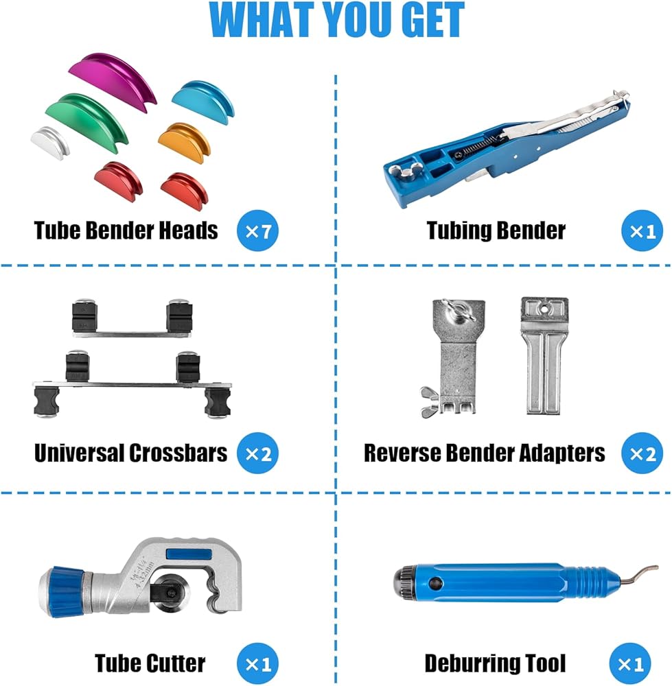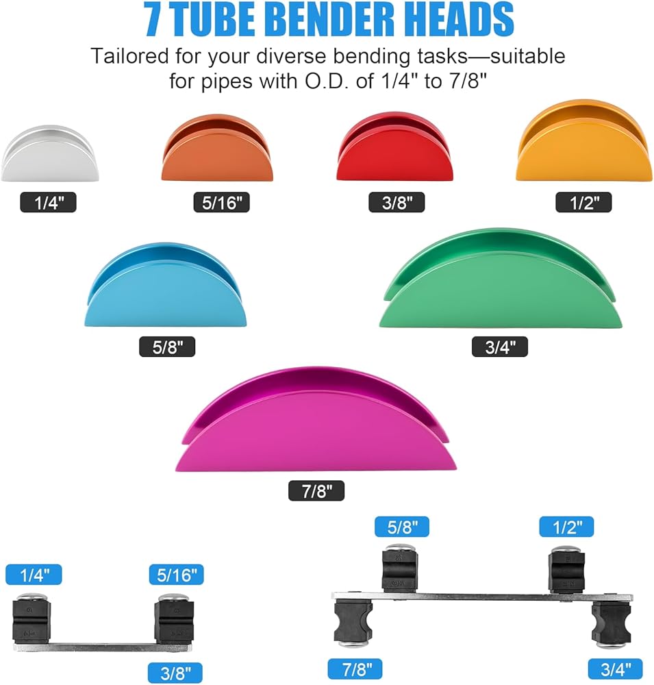 مجموعة كاملة: تشتمل مجموعة ثني الأنابيب الكل في واحد على 7 رؤوس ثني من سبائك الألومنيوم الملونة تغطي أحجام الأنابيب من 1/4 بوصة إلى 7/8 بوصة لتحديد سريع. تأتي مجموعة ثني الأنابيب مع أداة ثني الأنابيب السقاطية، وقاطعة الأنابيب، وأداة إزالة الأزيز، ومحولي ثني عكسي، وعارضتين عالميتين، وحقيبة تخزين محمولة - كل ما يلزم لمهام ثني الأنابيب