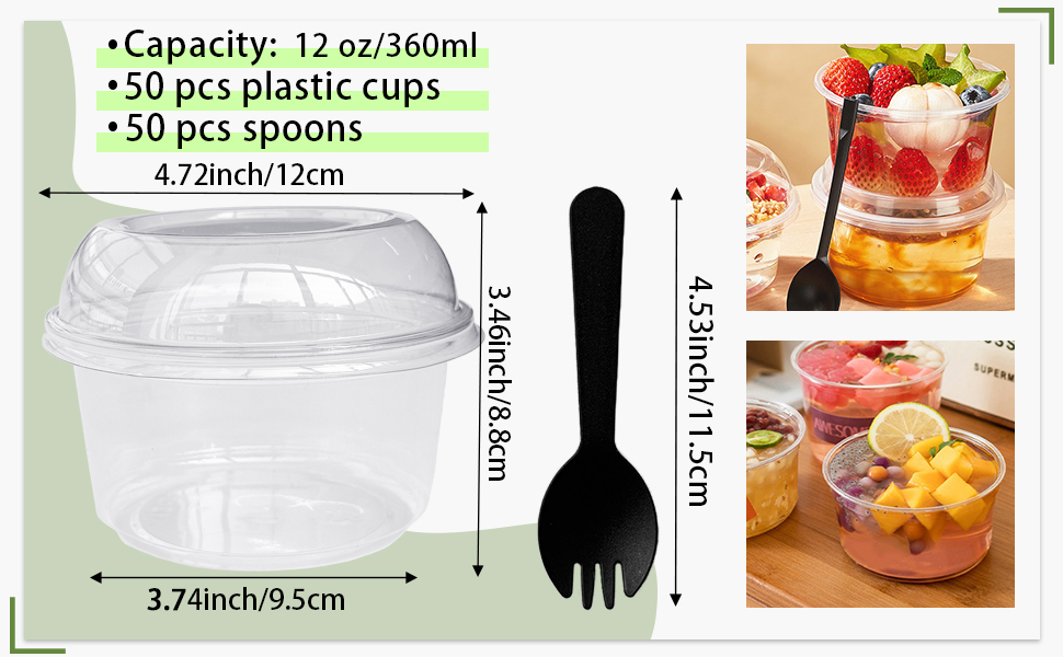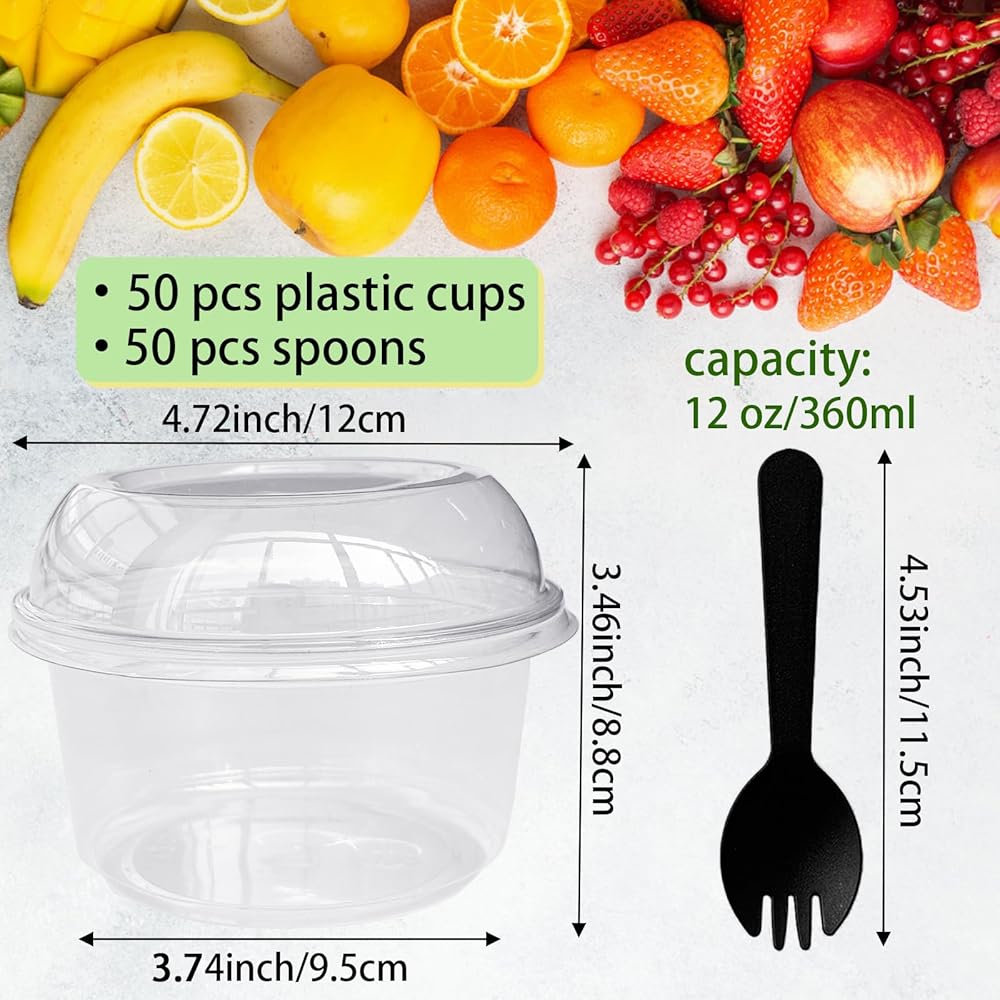 tiaiidi 50 حزمة 12 أوقية أكواب بلاستيكية شفافة يمكن التخلص منها مع أغطية قبة وملاعق، أكواب الحلوى البلاستيكية، أوعية الوجبات الخفيفة القابل للتصرف للآيس كريم، الكعك، الوجبات الخفيفة، الفاكهة، المشروبات الباردة، اللبن المخفوق، الحلوى، السلطة