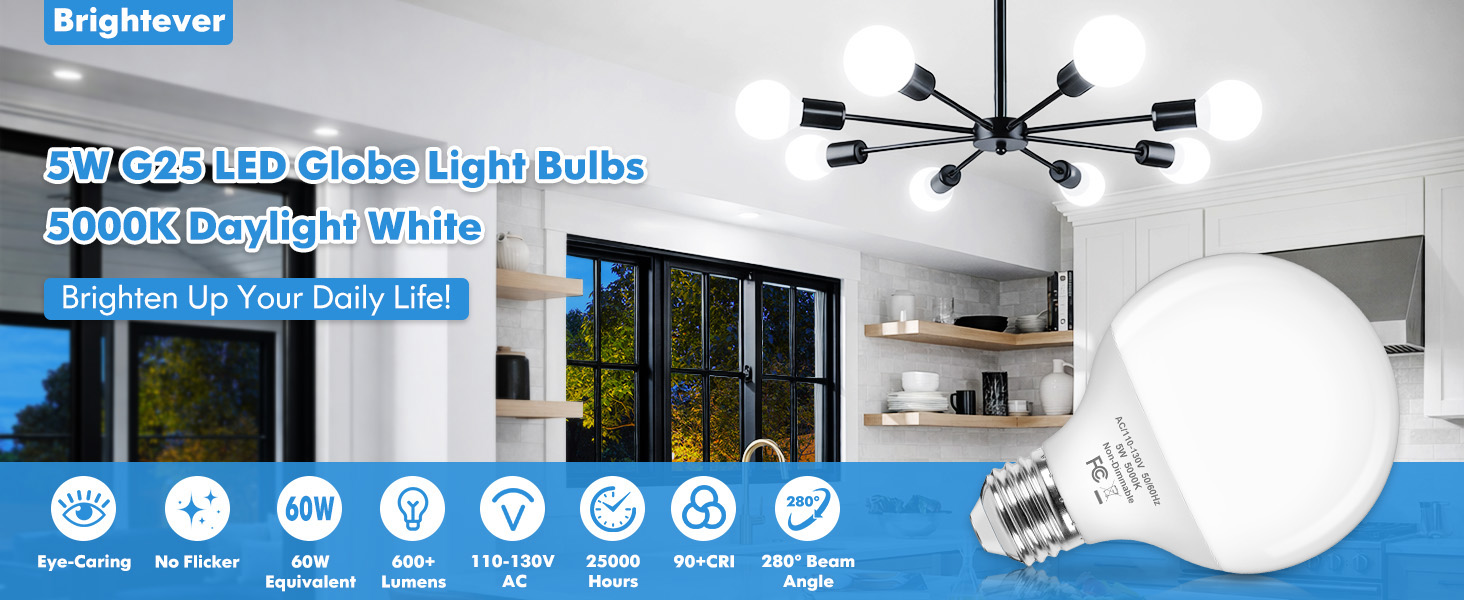Brightever G25 LED Globe لمبات الإضاءة المكافئة 60W، 5000K ضوء النهار الأبيض LED مصابيح الغرور مع قاعدة E26 القياسية للحمام، لمبة إضاءة مستديرة 5W لمرآة الغرور، 600LM، 4 عبوات، غير قابلة للتعتيم