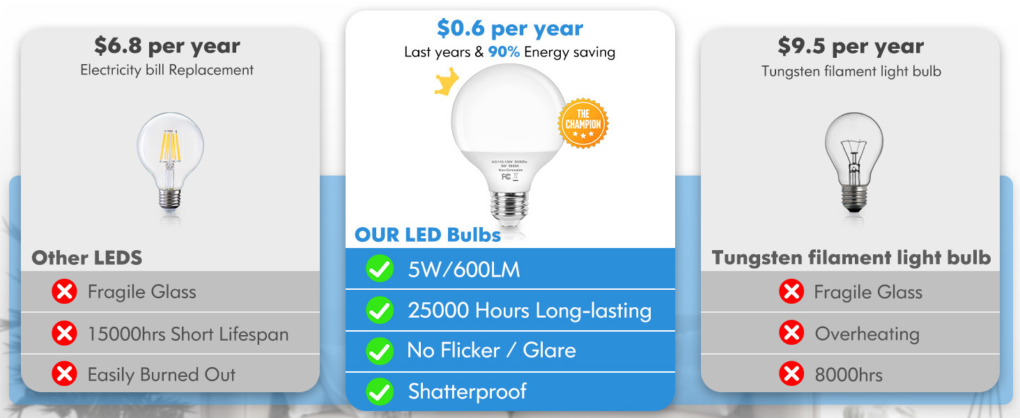 مصابيح LED خالية من الوميض وصديقة للعين: تم تصميمها باستخدام تقنية التيار المستقر، توفر مصابيح LED الكروية هذه ضوءًا ثابتًا وخاليًا من الوميض يمنع إجهاد العين - حتى أثناء جلسات المكياج الممتدة، أو القراءة في وقت متأخر من الليل، أو ساعات العمل الطويلة. خالي من الزئبق وآمن للاستخدام اليومي.