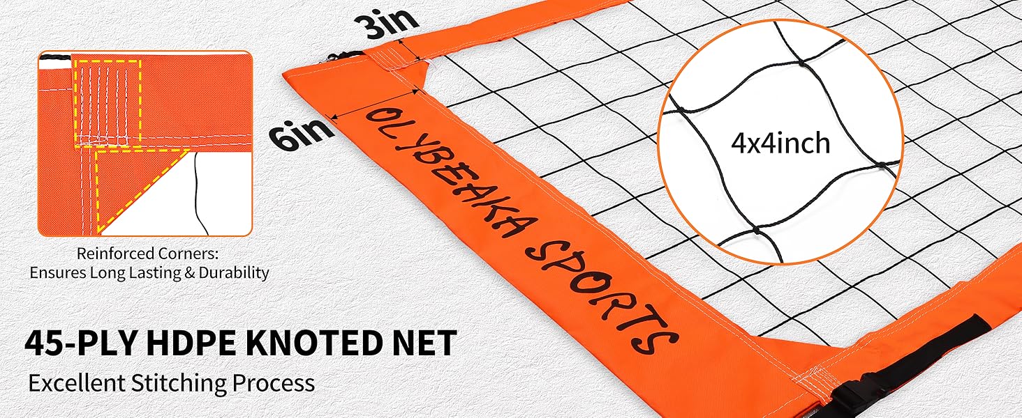 𝐔𝐧𝐛𝐞𝐚𝐭𝐚𝐛𝐥𝐞 𝐒𝐭𝐚𝐛𝐢𝐥𝐢𝐭𝐲: Secure your outdoor volleyball net effortlessly. Attach the top carabiner of guide rope to the eye bolts on the poles, drive the 10" L, 8mm-thick ground stakes with provided hammer into the ground, and use our premium 22mm-diameter beechwood tension rods—larger and more ergonomic than plastic alternatives—to keep the poles upright. This setup withstands powerful ball impacts, ensuring steady play on grass, sand, or in your backyard.