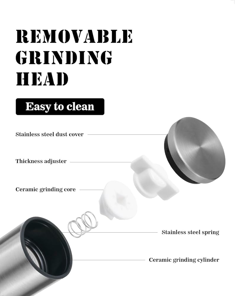 Each individual salt and pepper grinder features a generously sized capacity, The stainless steel top also twists off for easy refill access. can grind not only salt and pepper, but also cloves, cumin, peppercorns, etc