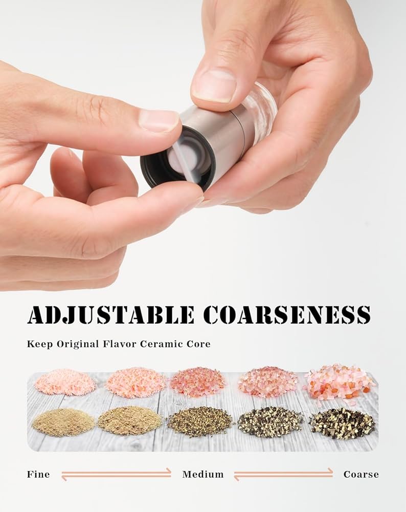 An efficient adjustable non-corrosive ceramic grinder on the top of each salt pepper grinders, just simply twist to Enjoy freshly ground salt or pepper to suit your taste