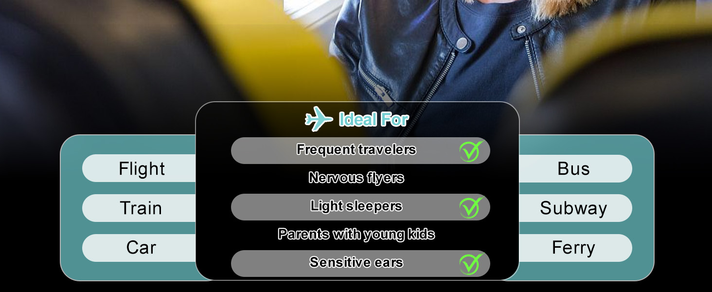 تقليل الضوضاء: حجب صوت المحرك المستمر وثرثرة المقصورة وغيرها من الضوضاء المزعجة. مع تصنيف عالٍ لتقليل الضوضاء يبلغ 26 ديسيبل، من خلال التوسيد ضد تغيرات الضغط المفاجئة وكتم الأصوات القاسية، تساعد سدادات الأذن القابلة لإعادة الاستخدام على منع أذن الطائرة وتقليل خطر طنين الأذن (رنين الأذن) بعد رحلتك.