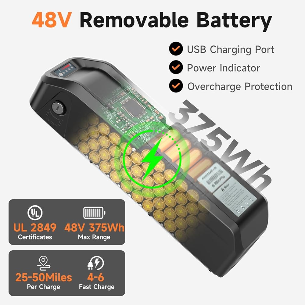 بطارية قابلة للإزالة بقدرة 374 وات في الساعة - يمكنك ركوب المزيد، وشحن سهل: بطارية ليثيوم عالية الكفاءة بقدرة 48 فولت و7.8 أمبير في الساعة تدعم التنقل اليومي والرحلات البحرية في عطلة نهاية الأسبوع. تصميم قابل للإزالة يجعل الشحن الداخلي بسيطًا ومريحًا