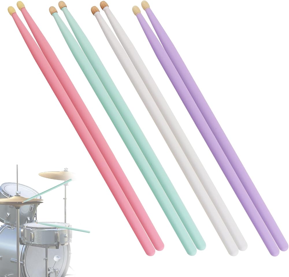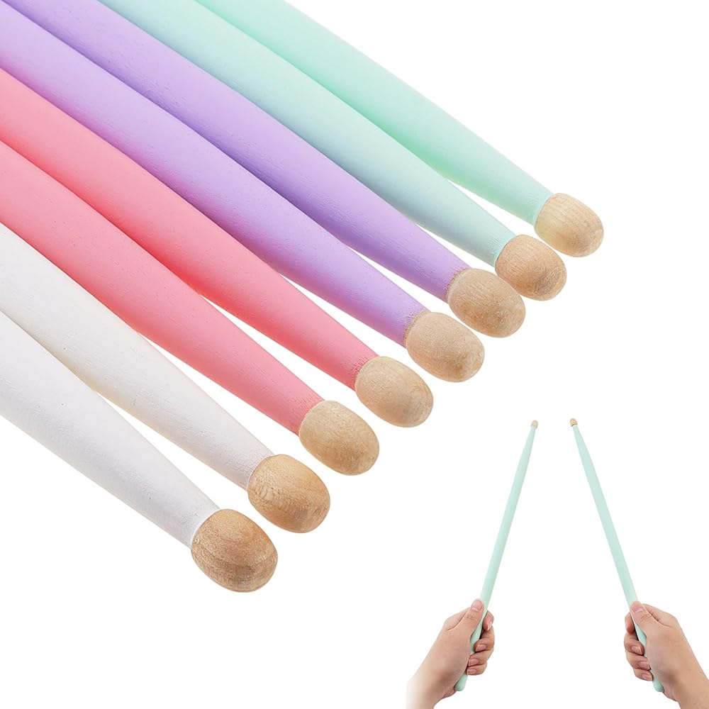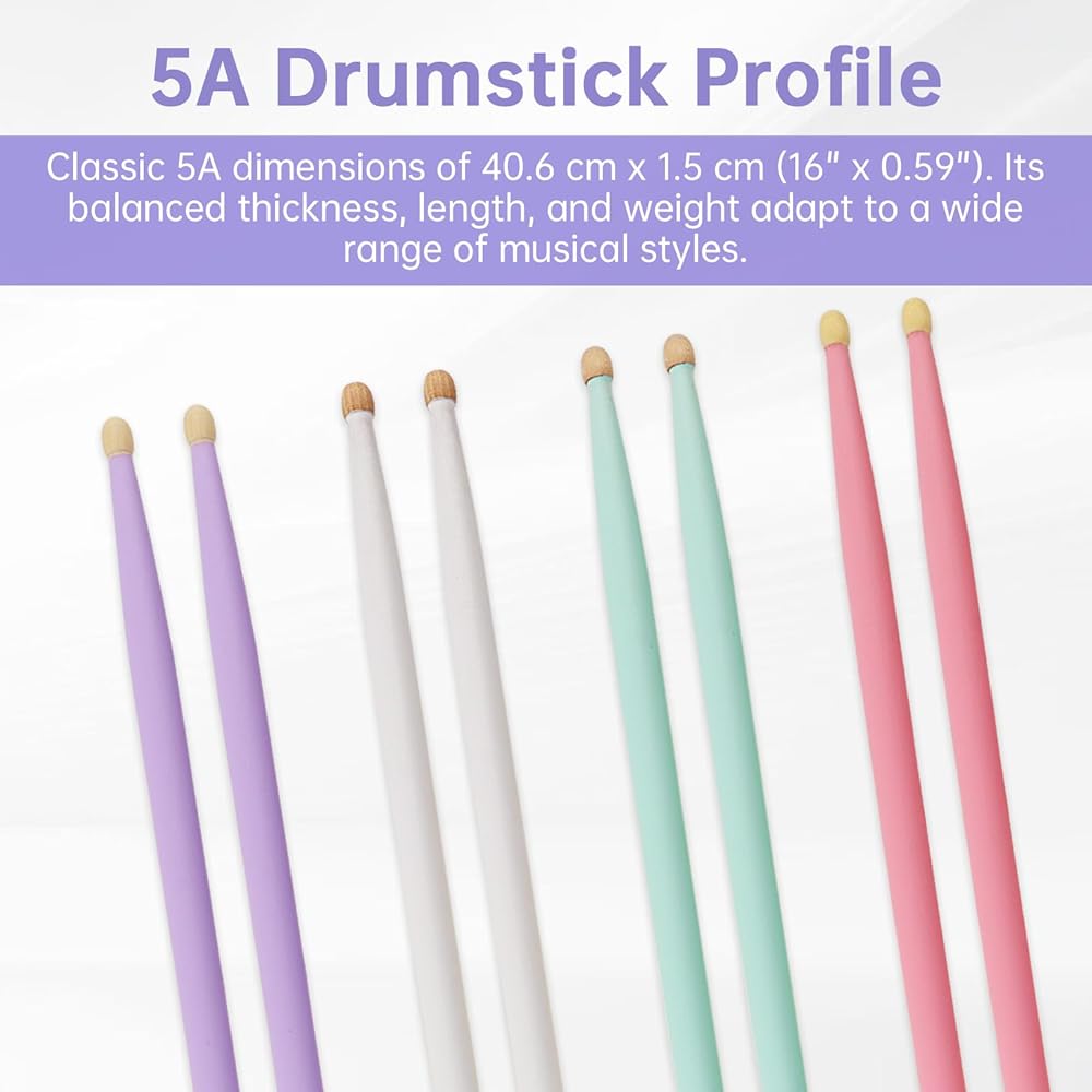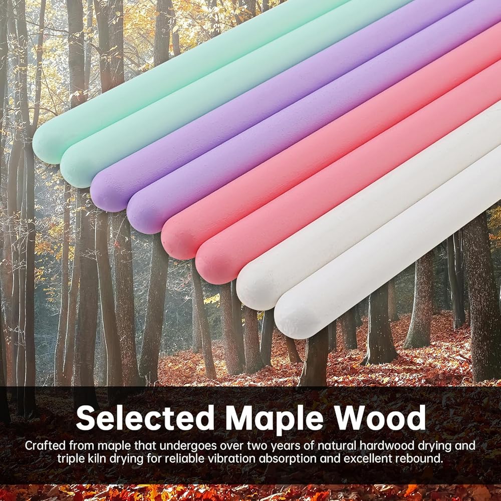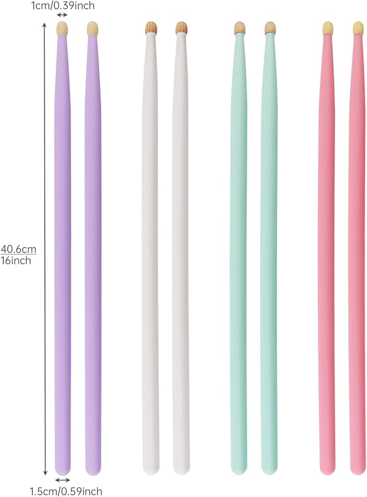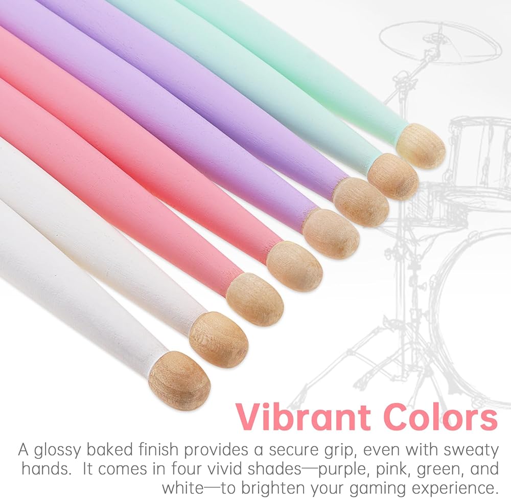 - Vibrant Colors: A glossy baked finish ensures a secure grip, even with sweaty hands. Each package includes 4 pairs of drumsticks available in four vivid shades: Purple, pink, green, and white, to brighten your gaming experience.