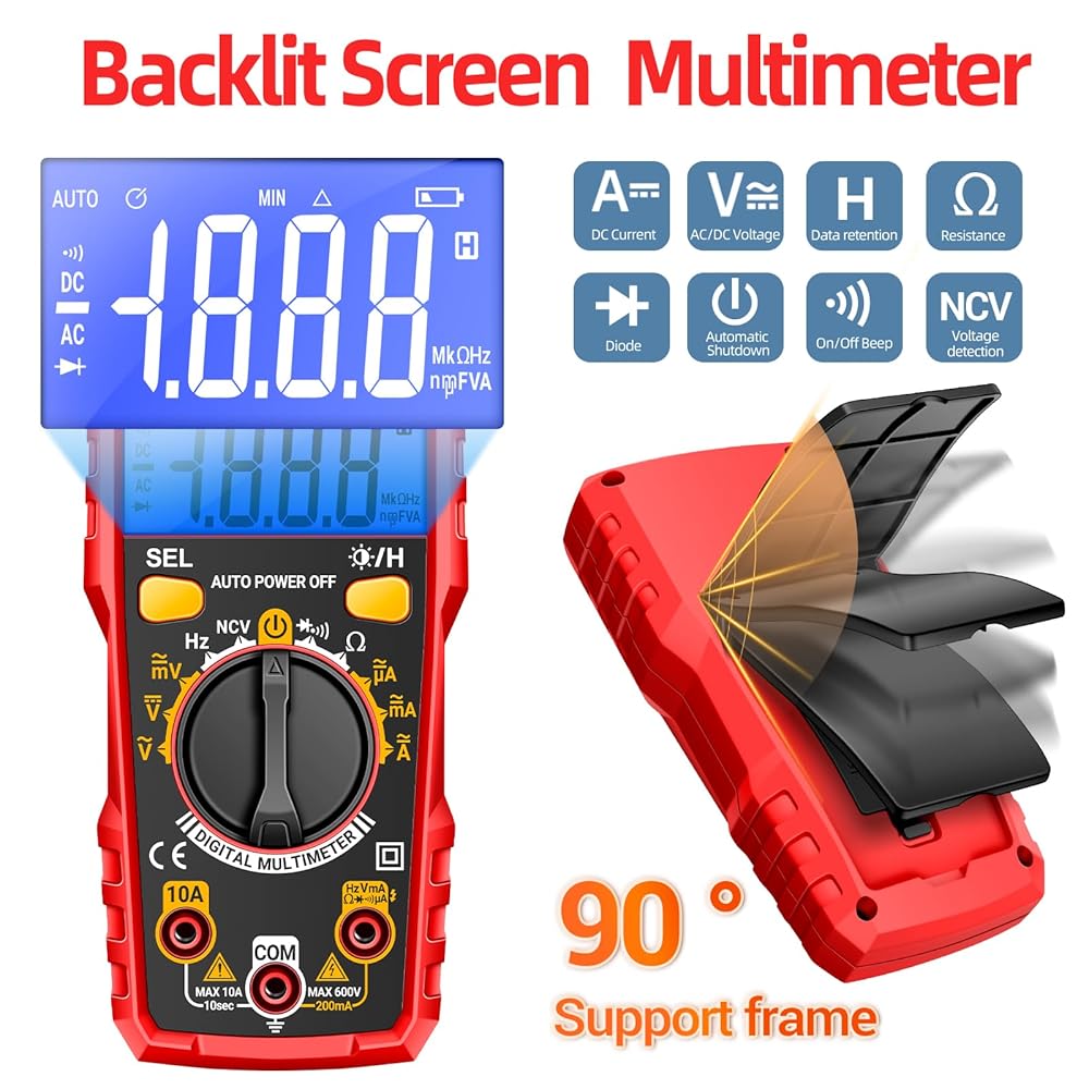 مقياس رقمي متعدد الدقة: SZ303 متعدد القياسات جهد التيار المتردد/التيار المستمر (600 فولت)، تيار تيار متردد/تيار مستمر (10 أمبير)، المقاومة (20 ميجا أوم)، التردد (2 ميجا هرتز)، والصمام الثنائي مع 1999 شاشة بإضاءة خلفية عالية الدقة. يتميز باحتجاز البيانات، وعرض الإضاءة الخلفية، وإيقاف التشغيل التلقائي، والكشف عن جهد عدم الاتصال (NCV) لاستكشاف الأخطاء وإصلاحها بشكل آمن