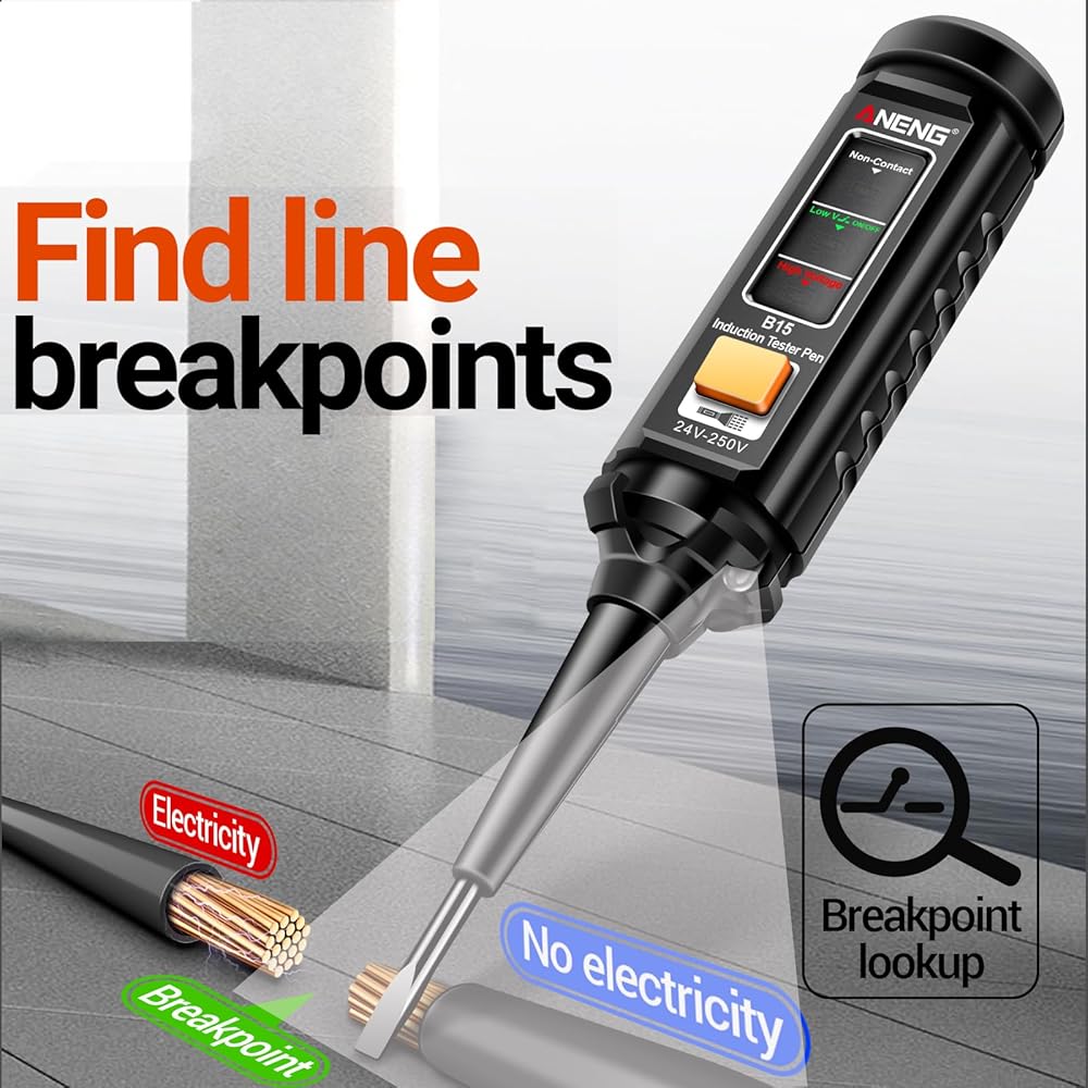 قلم اختبار كهربائي مع مصباح يدوي: جهاز اختبار عدم الاتصال B15 يكتشف الجهد الكهربي 24 فولت - 250 فولت تيار متردد دون لمس الأسلاك؛ جهاز كشف نقاط التوقف المدمج ومنبه الصوت/الضوء لتحديد موقع الأخطاء على الفور. يتضمن وظيفة الاختبار الذاتي، والكشف عن البطارية، ومصباح LED مدمج للوحات الكهربائية الداكنة