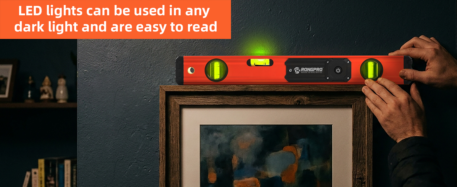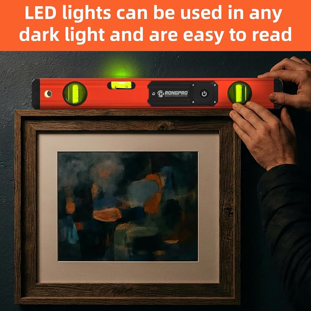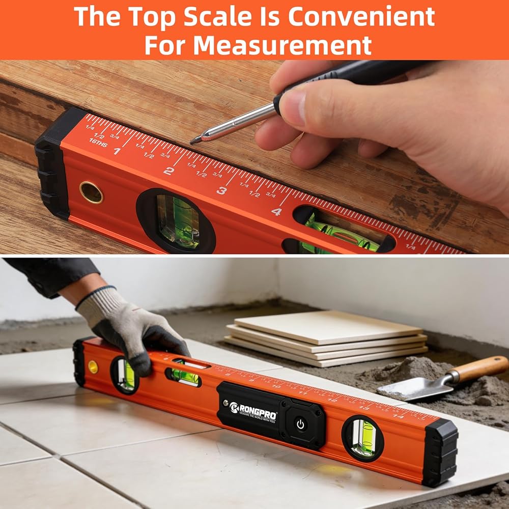 ✅[مستوى 16 بوصة مع إضاءة] تأتي مسطرة المستوى 16 بوصة مع إضاءة مدمجة، مما يجعلها مناسبة للاستخدام في المناطق ذات الإضاءة الضعيفة أو في الليل، ويمكن رؤية شاشة الضوء من كل زاوية ومن مسافات قصيرة، مما يجعل من السهل استخدام هذا المستوى من الأعلى والأسفل وفي الزوايا الصعبة.