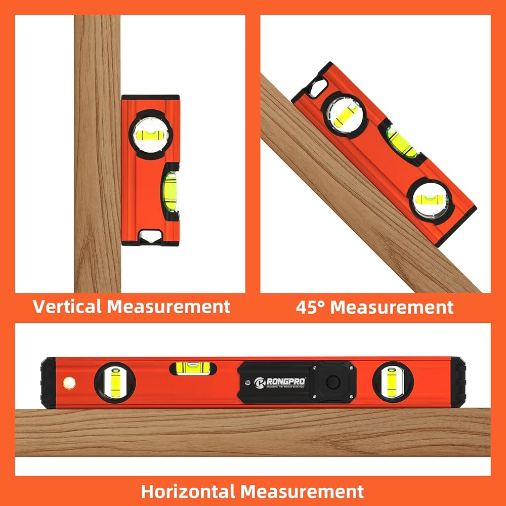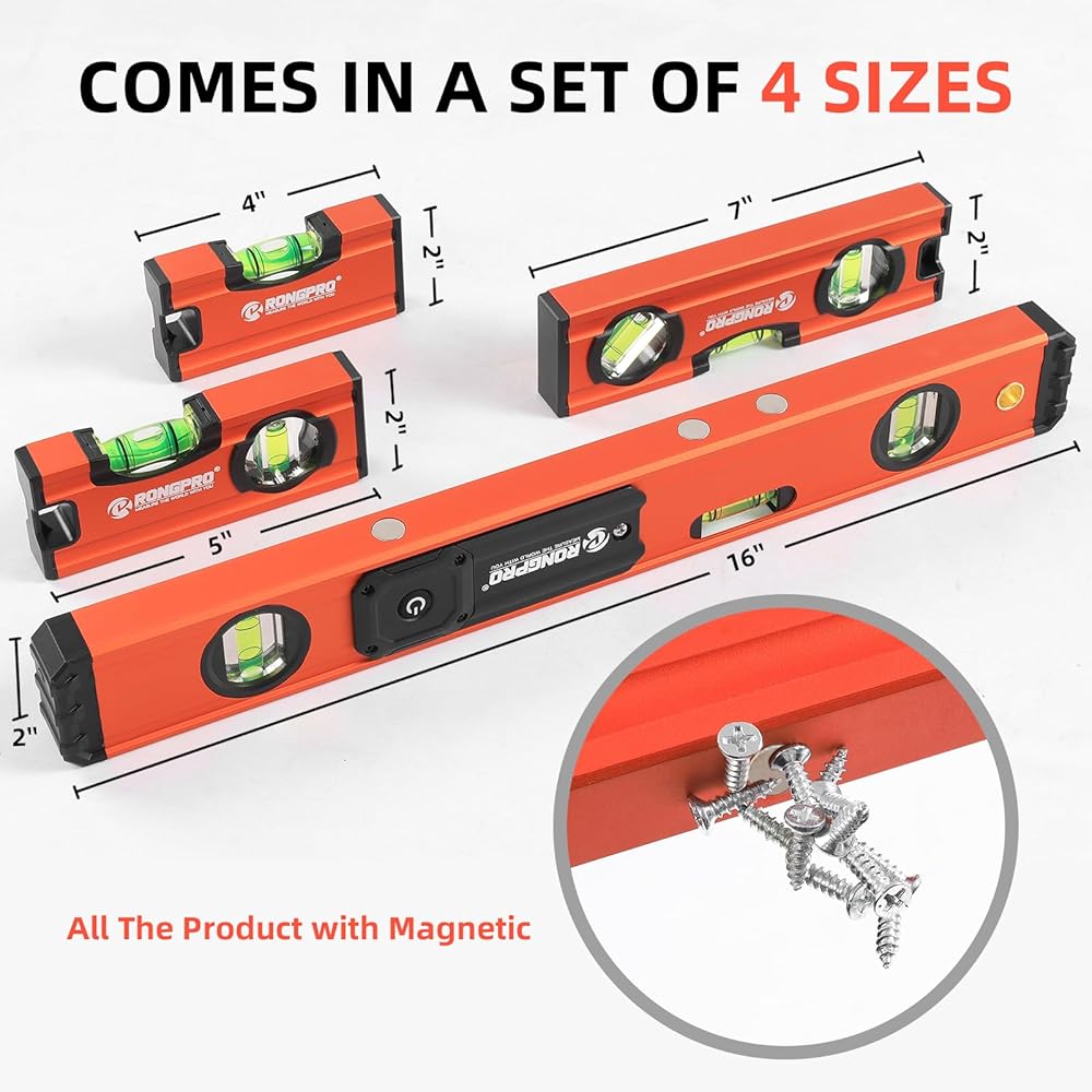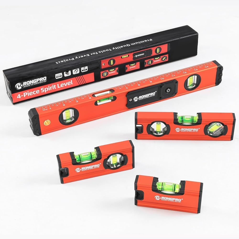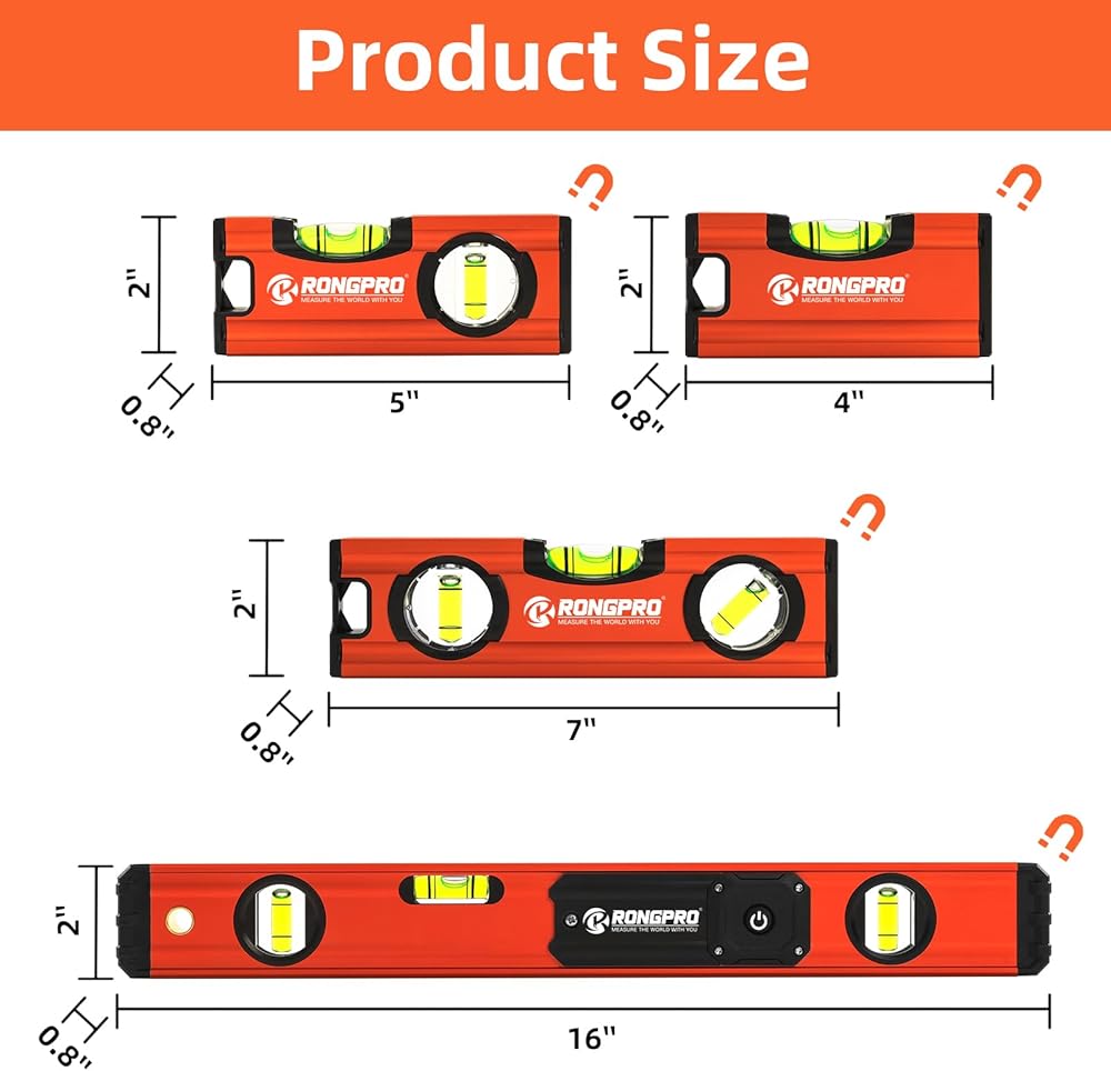 ✅【فقاعات كبيرة】 مجموعة مستويات سبيريت توربيدو من RONGPRO مكونة من 4 قطع، بما في ذلك 4 بوصات و5 بوصات و7 بوصات و16 بوصة. الحجم الأصغر لمسطرة المستوى مناسب للاستخدام في المساحات الصغيرة، كما أن فقاعة الماء الأكبر سهلة القراءة.