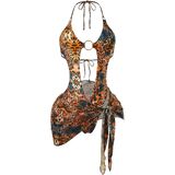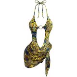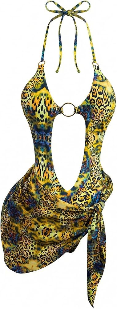 • Womens One Piece Swimsuits, Summer Hawaiian Outfits, Sexy Monokini Swimsuits, Two Piece Sets, One Piece Bathing Suit with Tie Wrap Skirt, Cheetah Graphic, Cut Out, Metal Ring, Tie Backless