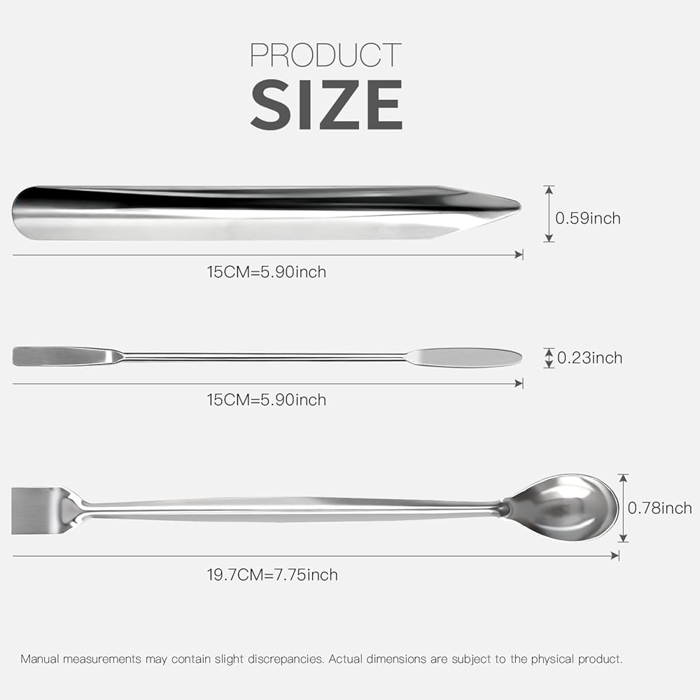 • الحجم: ①مقاييس مغرفة أخذ العينات: الطول: 15 سم / 5.90 بوصة، العرض: 1.5 سم / 0.59 بوصة. ② مقاسات المكشطة الصغيرة: الطول: 15 سم/5.9 بوصة، العرض: 0.6 سم/0.23 بوصة. ③مقاسات المكشطة الكبيرة: الطول: 19.7 سم/7.75 بوصة، العرض: 2 سم/0.78 بوصة