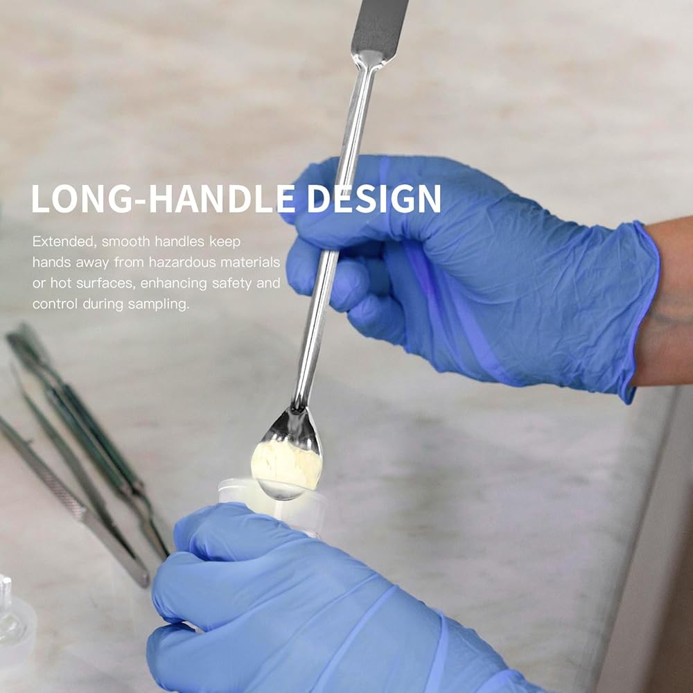 • تصميم بمقبض طويل: تتميز مجموعة ملاعق أخذ العينات بتصميم مريح. مقابض ممتدة وناعمة تبقي الأيدي بعيدًا عن المواد الخطرة أو الأسطح الساخنة، مما يعزز السلامة والتحكم أثناء أخذ العينات.