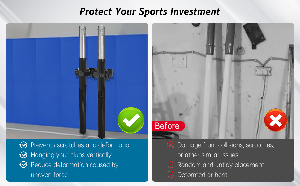 قم بحماية استثمارك الرياضي: يمنع حامل عمود كرة الطائرة على الحائط بشكل فعال الخدوش والتشوه. إن تعليق الهراوات بشكل عمودي يمنعها من الاصطدام والخدش بسبب التراص العشوائي، أو من الانحناء والتشوه بسبب الإجهاد غير المتساوي مع مرور الوقت. يؤدي ذلك إلى إطالة عمر أجهزتك والحفاظ على الأداء المتسق.