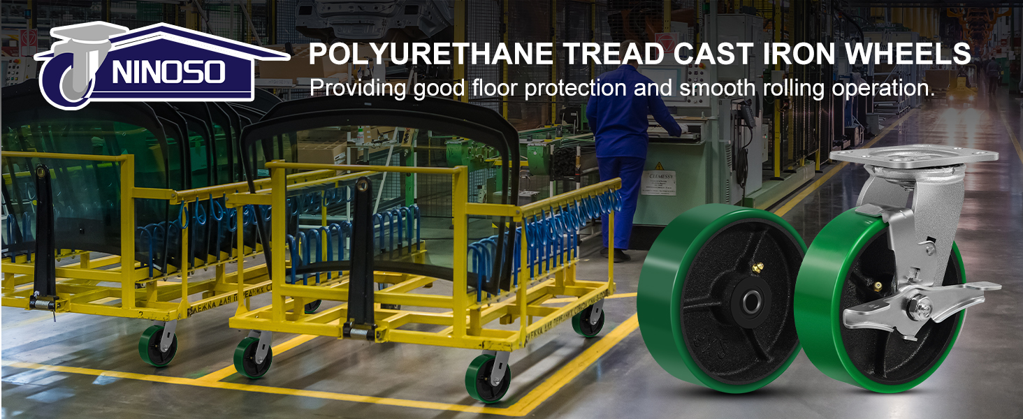 سعة الحمولة: 4 بوصات 800 رطل لكل عجلة، 5 بوصات 1000 رطل لكل عجلة؛ 6 ": 1200 رطل لكل عجلة؛ 8": 1500 رطل لكل عجلة. شريحة مبطنة ممتصة للصدمات توفر حماية للأرضية.