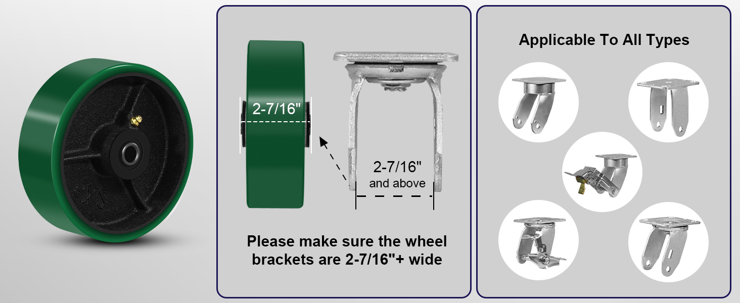 قطر العجلة: 4 بوصة/6 بوصة/5 بوصة/8 بوصة، عرض مداس العجلة: 2 بوصة. تجويف المحور: 1/2 بوصة، طول المحور: 2-7/16 بوصة، حجم المحمل: ¾ بوصة محمل أسطواني.